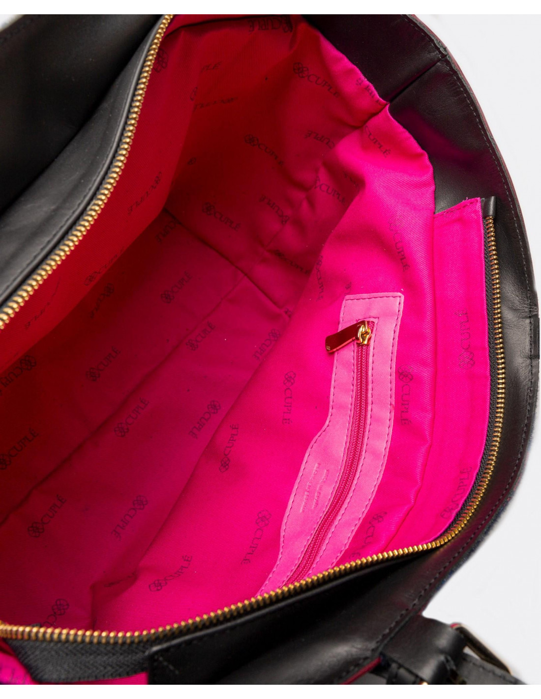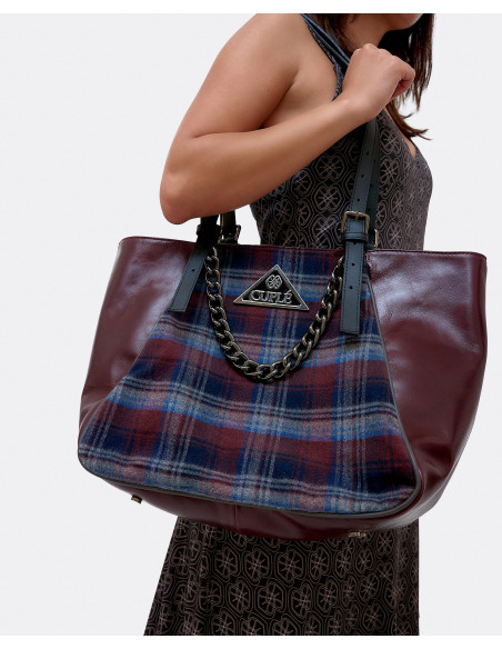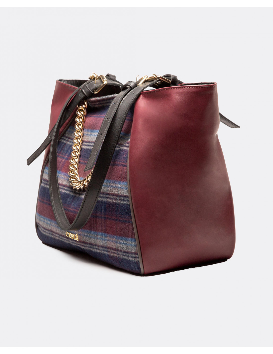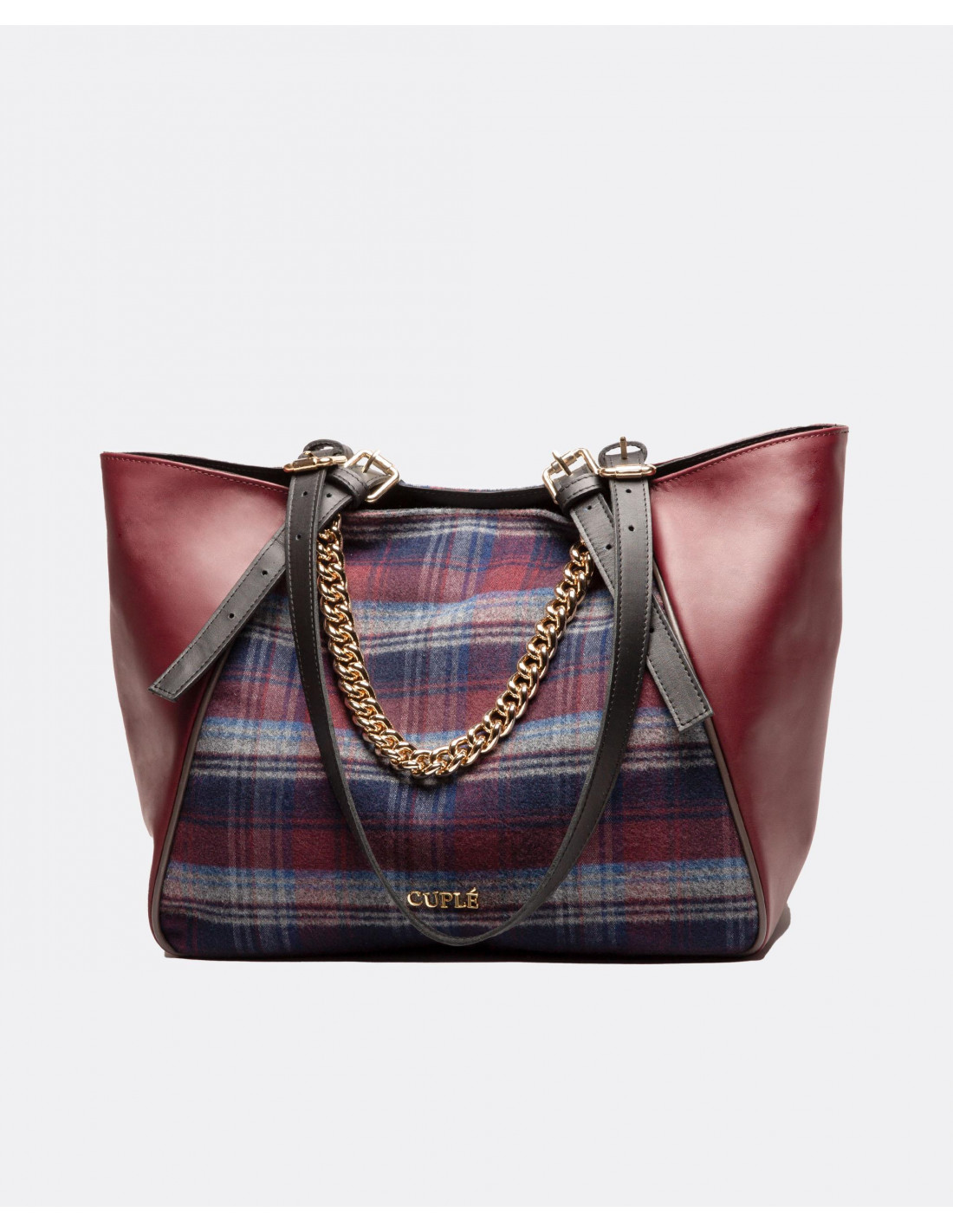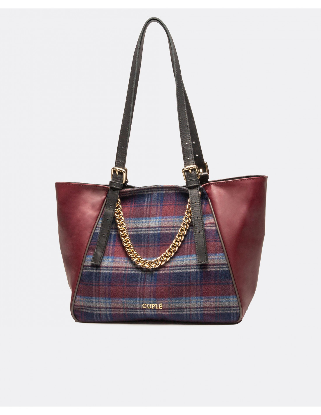 Bolso shopper grande tricolor Cuplé confeccionado en España con piel de alta calidad. Presenta el nombre de la marca y cadena dorada metálica a modo de adorno. Tiene doble asa regulable.