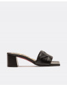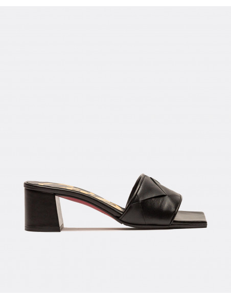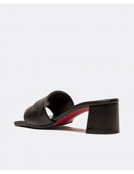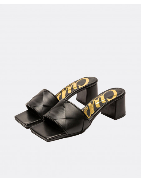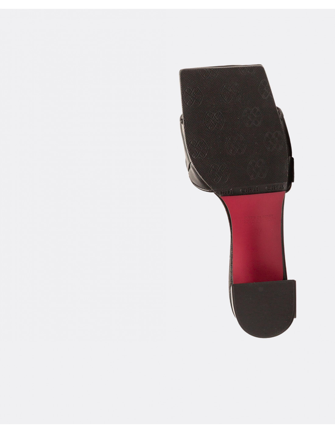 Sandalia de pala con tira delantera nude trenzada en el empeine. Detalle logotipo Cuplé, tacón medio negro y suela acabada en forma cuadrada.