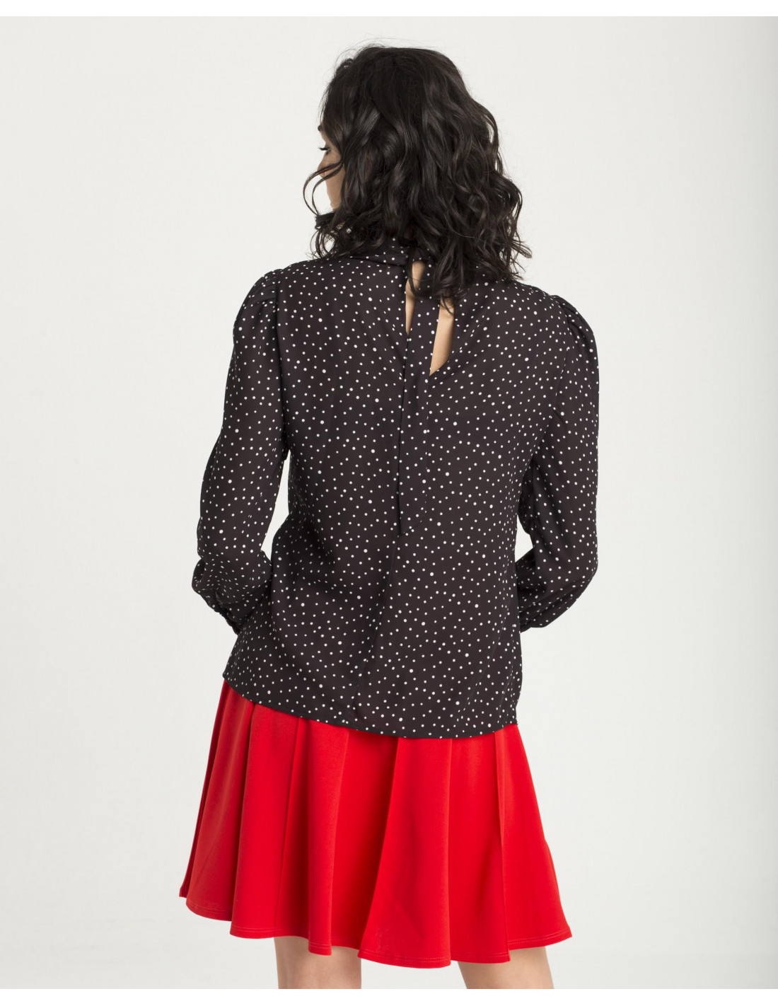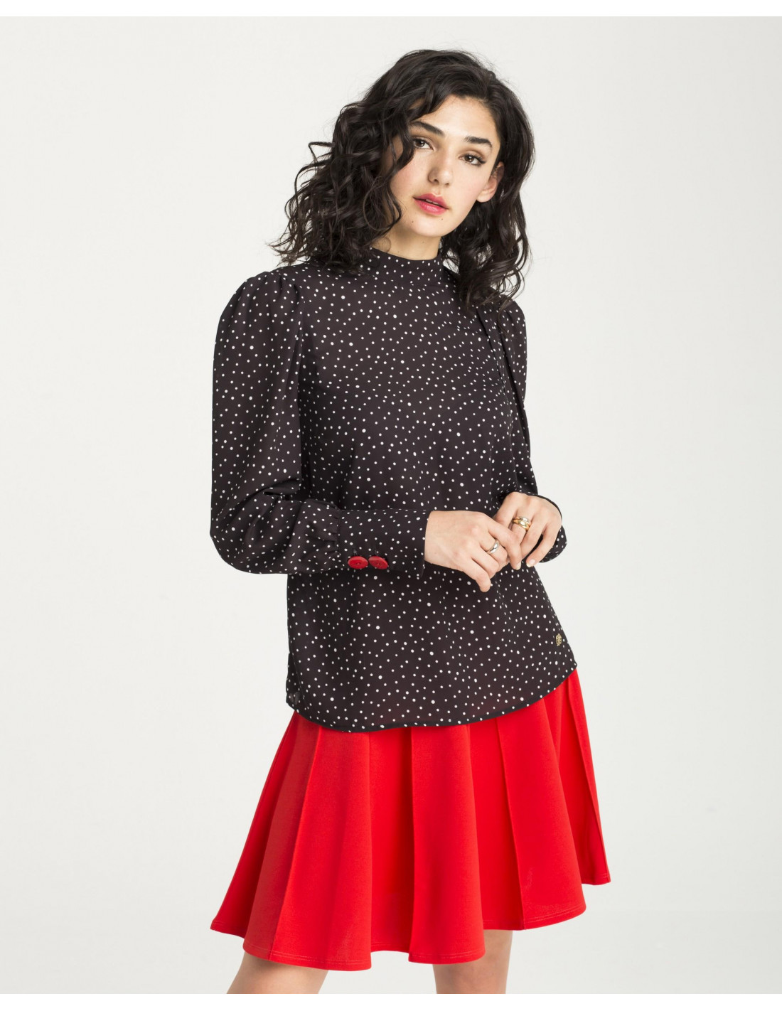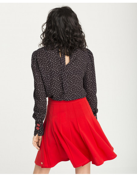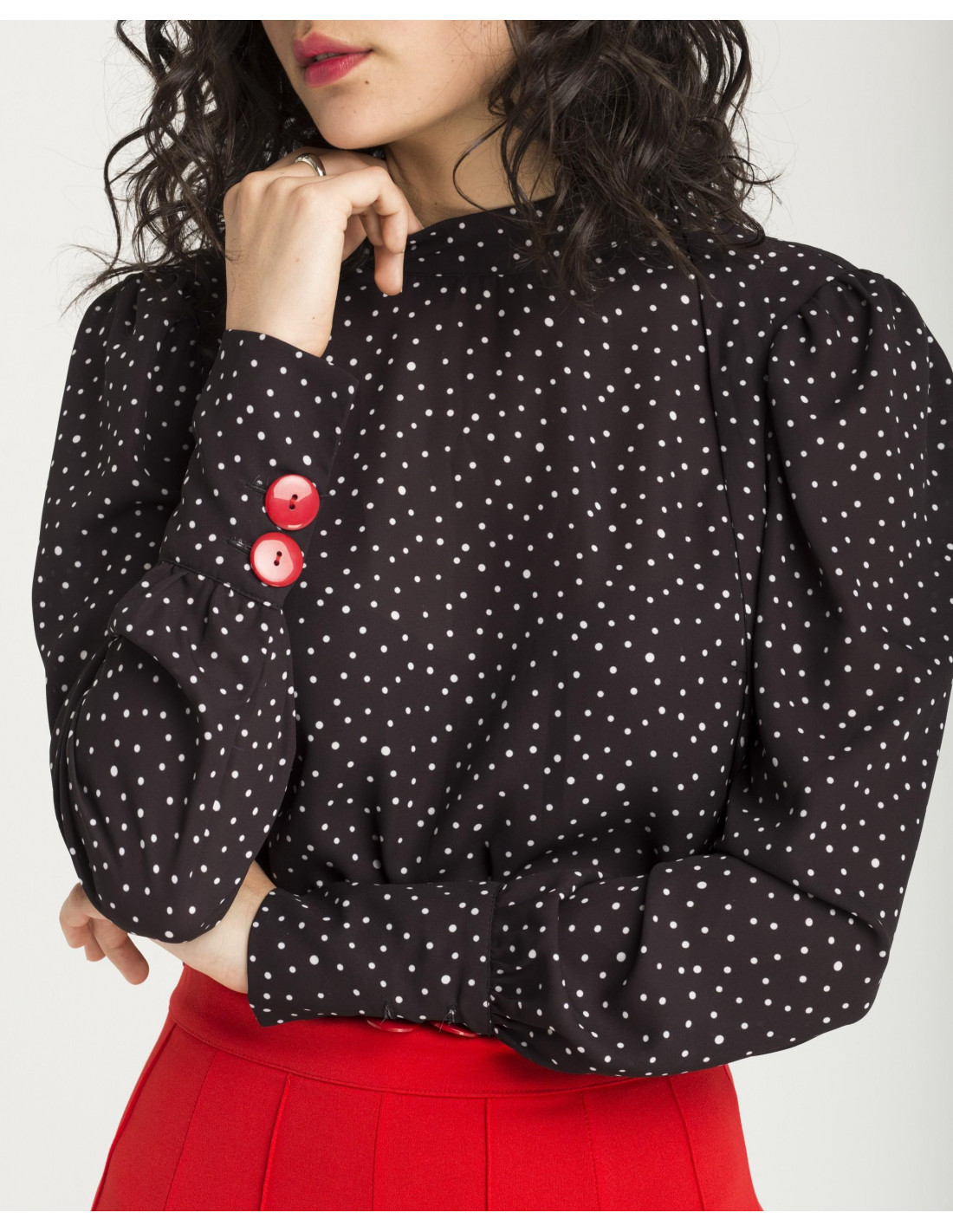 Camisa Cuplé, de puntos negra y blanca, con cuello alto, y mangas con volumen y muñeca ajustada. Dos botones rojos decoran las muñecas. Tiene una abertura en la espalda y se cierra con un lazo.