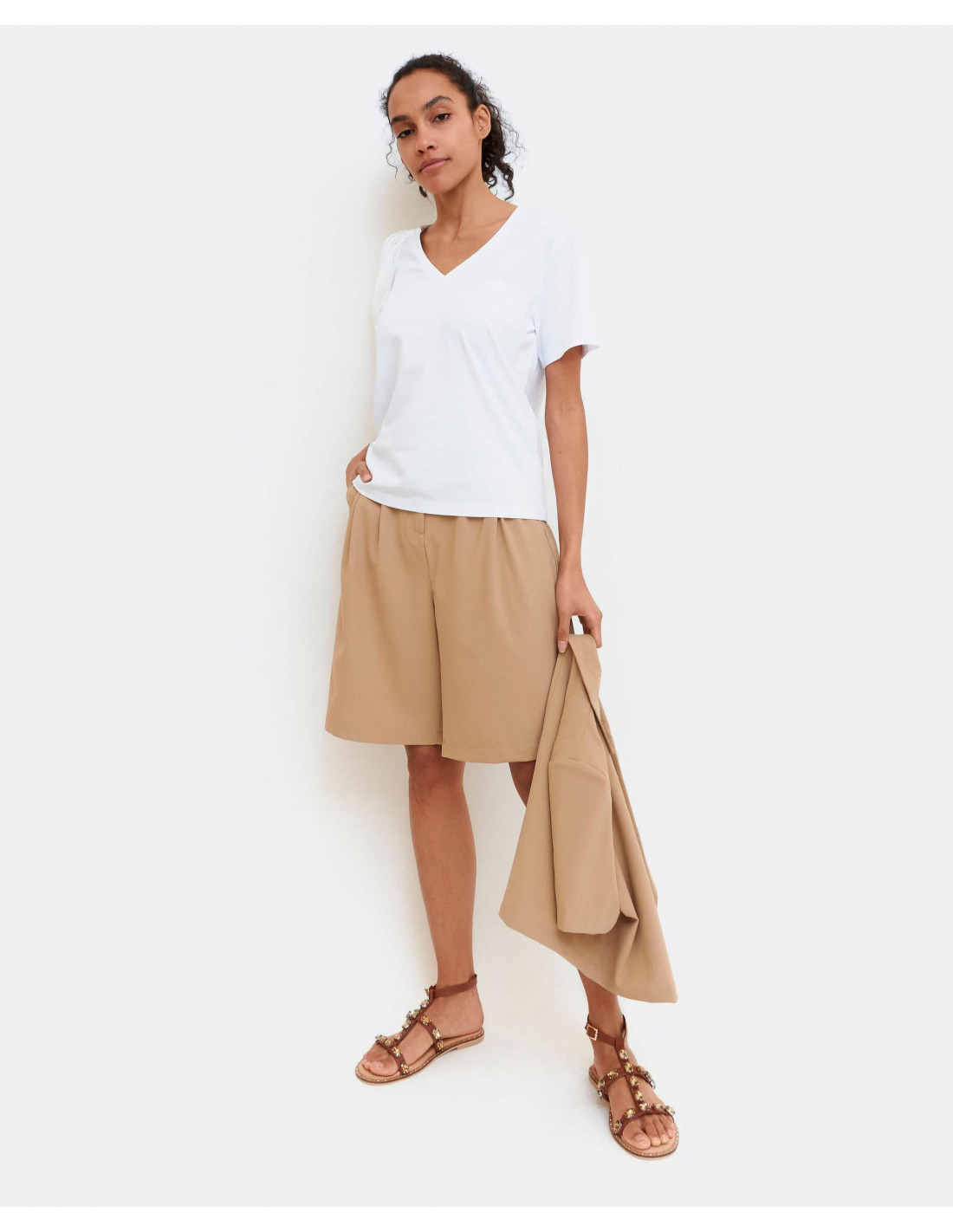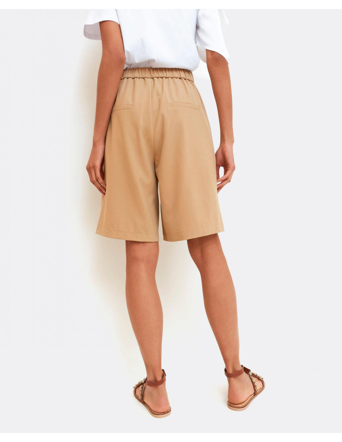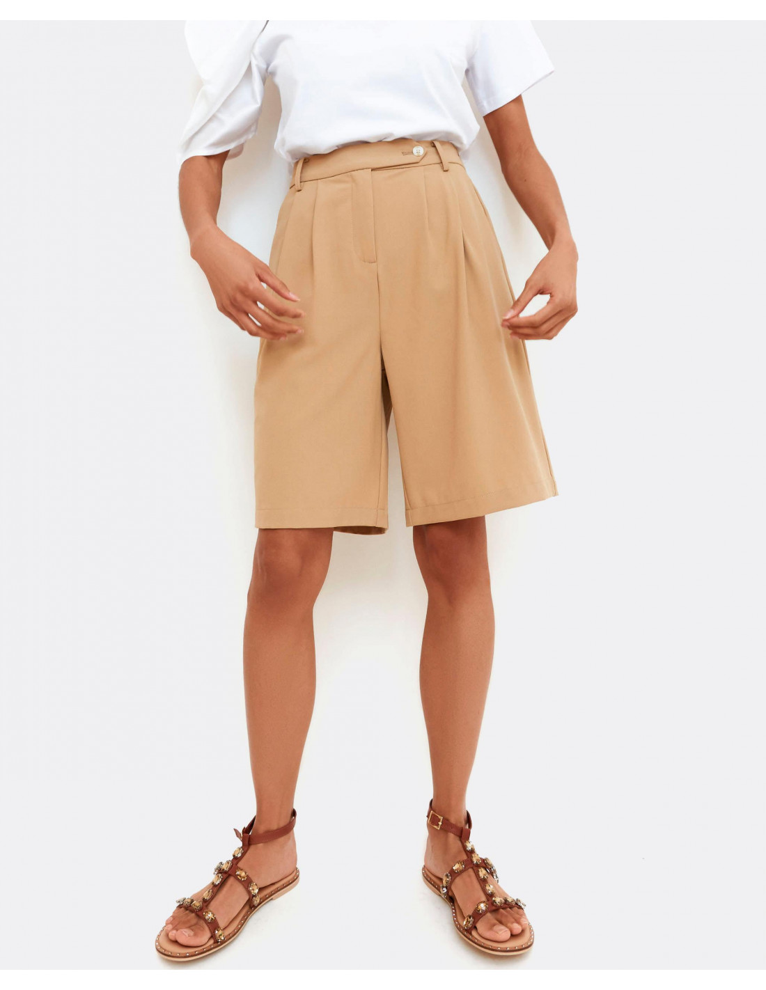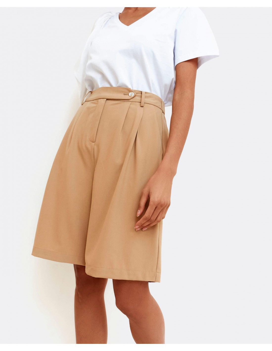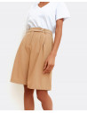 Bermuda de algodón color camel con trabillas en la cinturilla y botón hacia la izquierda, bolsillos laterales y pernera ancha.