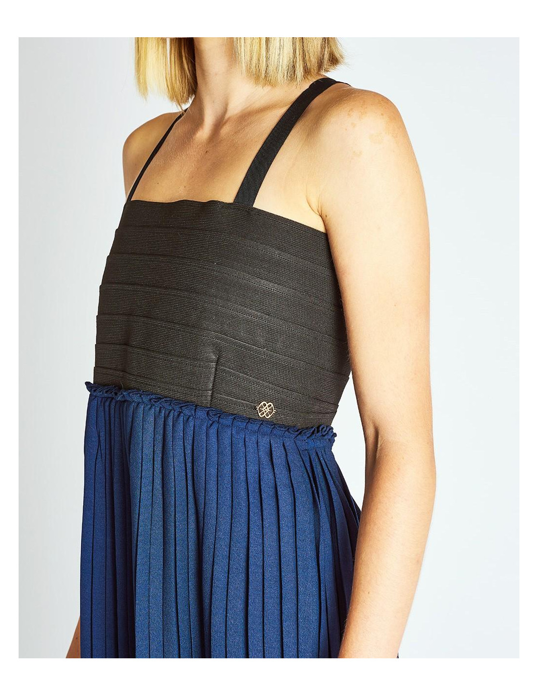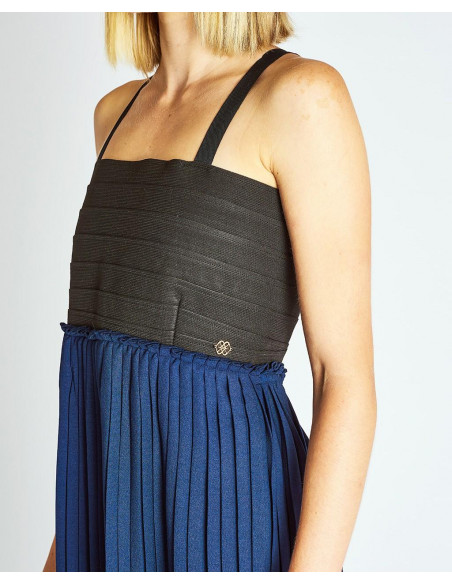 Maxi vestido en color azul marino y negro. Presenta escote cuadrado y tirantes finos. Se caracteriza por su corte bajo el pecho y su falda plisada. Fornitura Cuplé en color oro. Este año el corte plisado es tendencia. Color: Marino. New York City Collection. Medidas: Altura: 1´75 cms. Pecho: 80 cms. Cintura: 63 cms. Caderas: 90 cms.