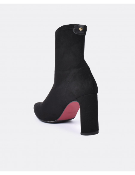 Botín en licra con tacón alto plano en color negro. Detalle con logo de la marca en color dorado en la parte trasera. Estilo elegante que eleva cada outfit.