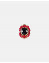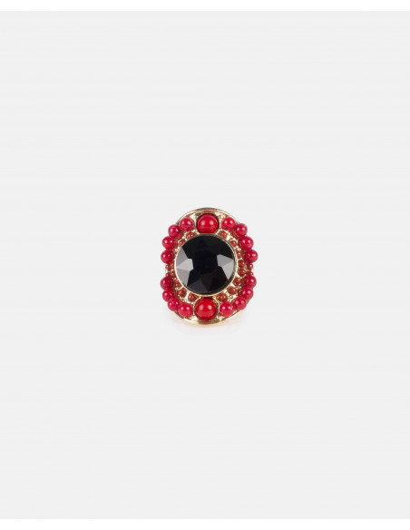 Anillo de piedras pequeñas rojas redondas y piedra más grande en el centro del mismo con base en oro. La pieza es ajustable a diferentes tamaños de dedos.