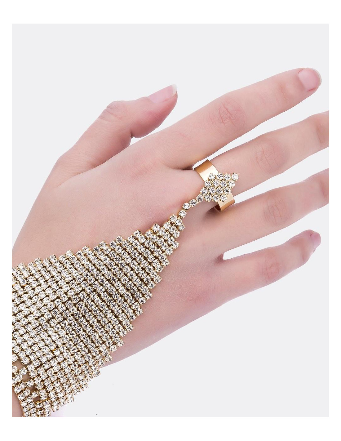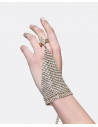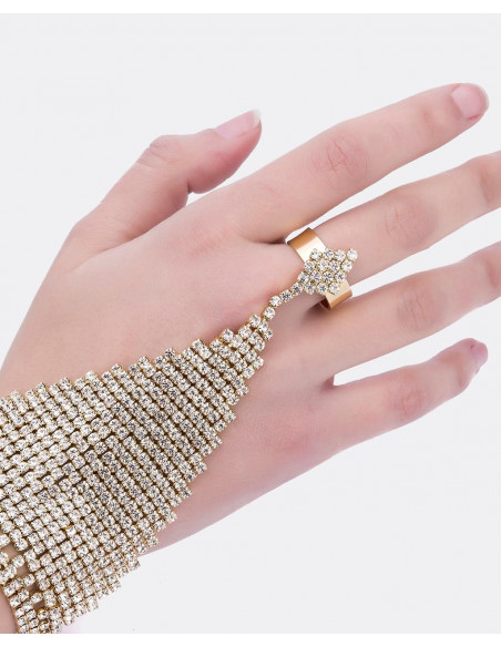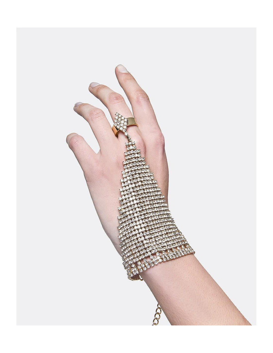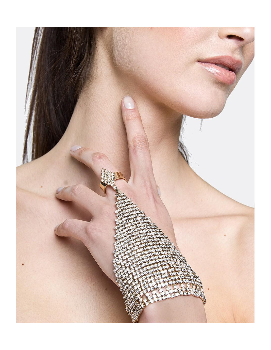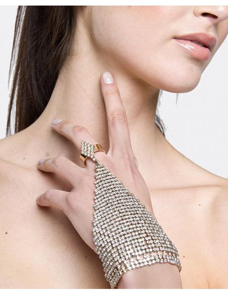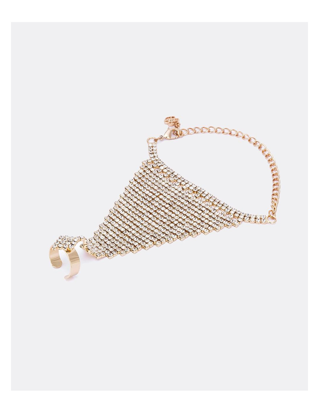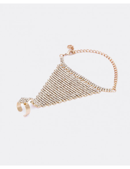 Pulsera Cuplé que recuerda a una malla. Lo que la hace diferente es que va cubierta de cristales de color oro y se ajusta a la mano con un anillo. ¡No pasarás desapercibida con ella!