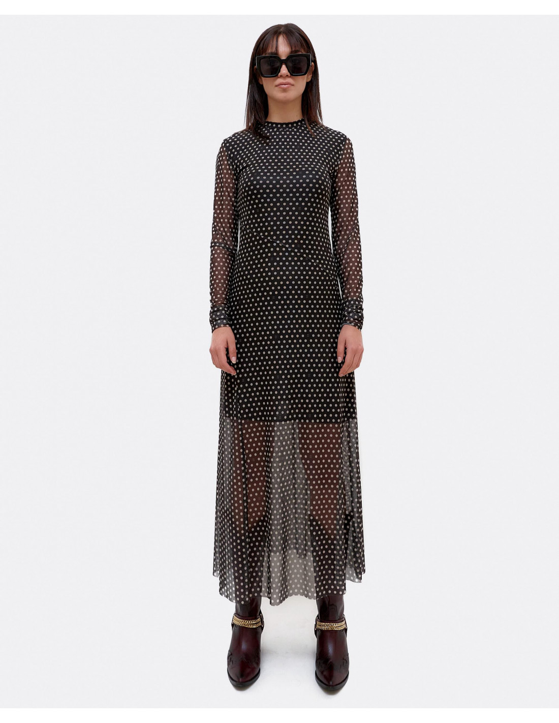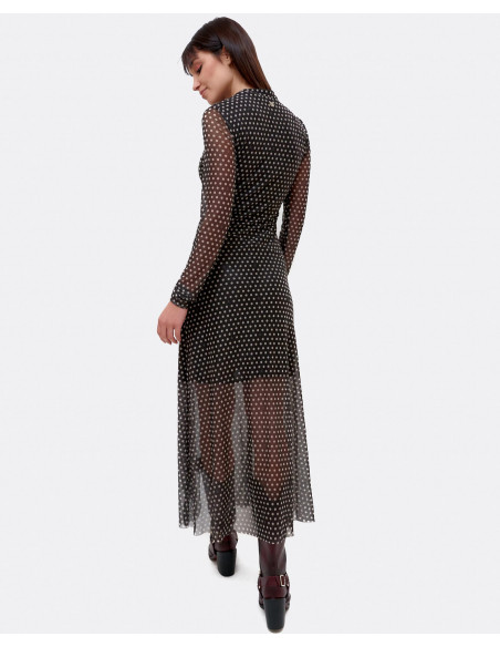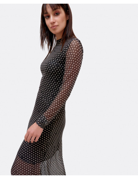 Vestido confecionado en tul con estampado de lunares de la colección invierno 2021,la prenda tiene un largo midi, de manga larga y forro interior en negro. Vestido ajustado, si deas que te quede más suelto te recomendamos te cojas una talla más. Perfecto para estas fiestas.