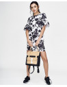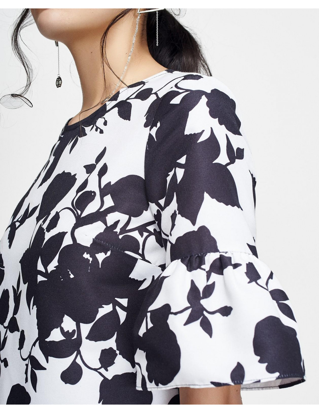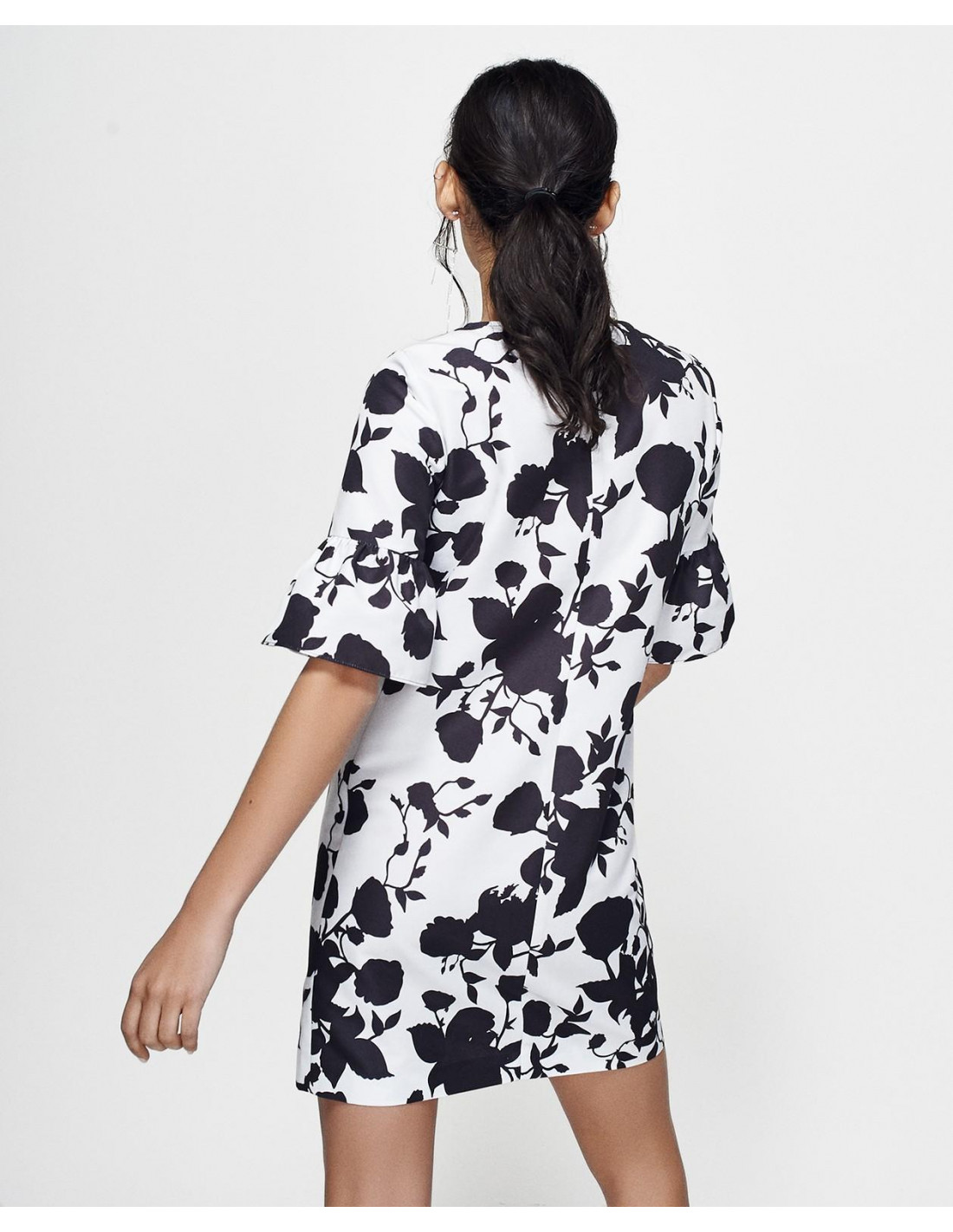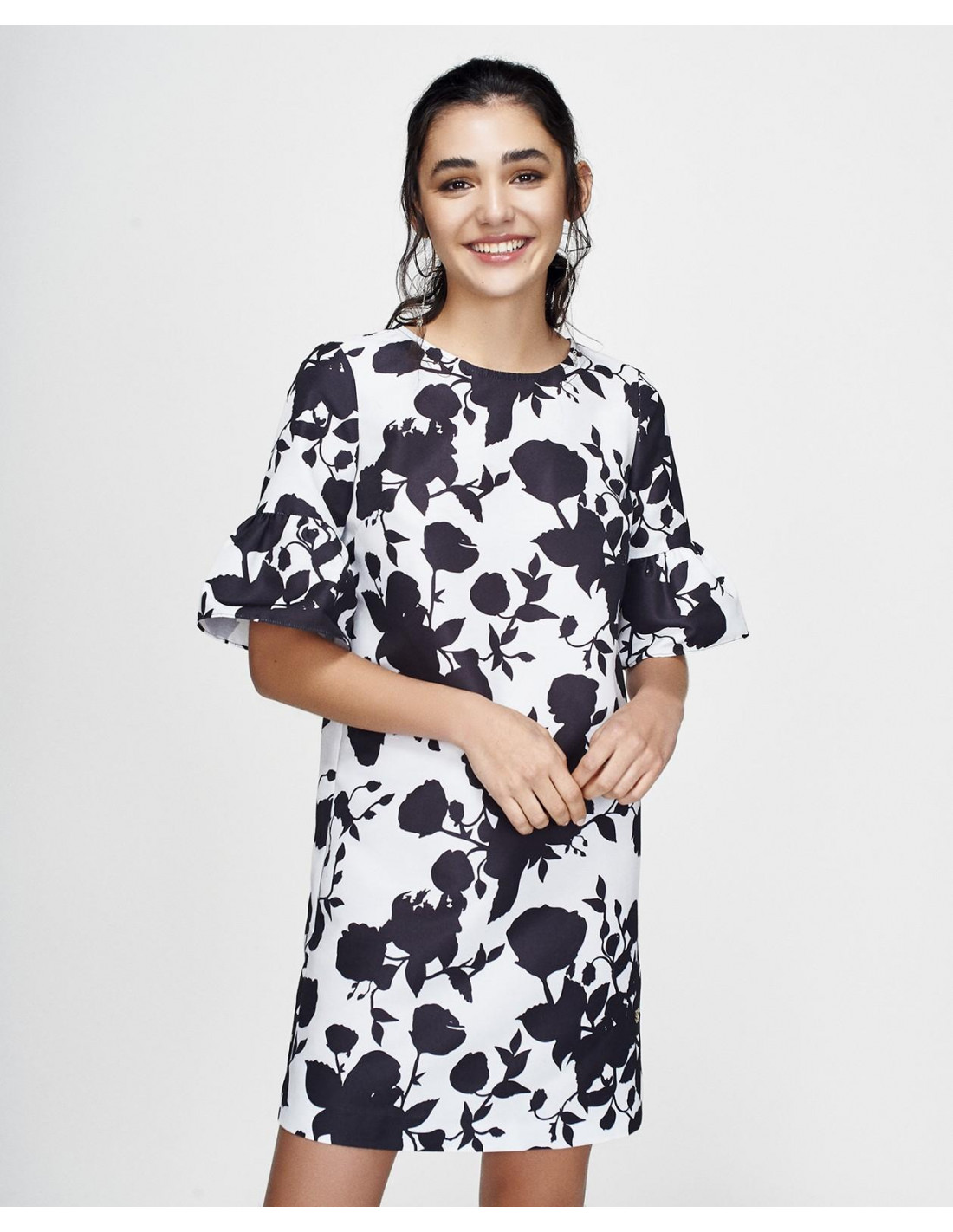 Vestido floral de Cuplé. Vestido de ceremonia con estampado floral en blanco y negro. Fabricado en tela otoman de corte recto. Diseñado en manga corta, con volantes al final de esta. Ideal para un evento especial.