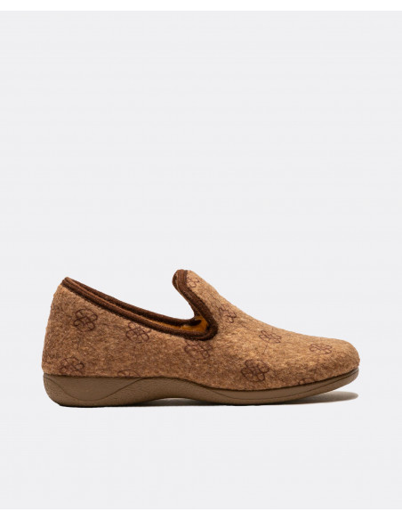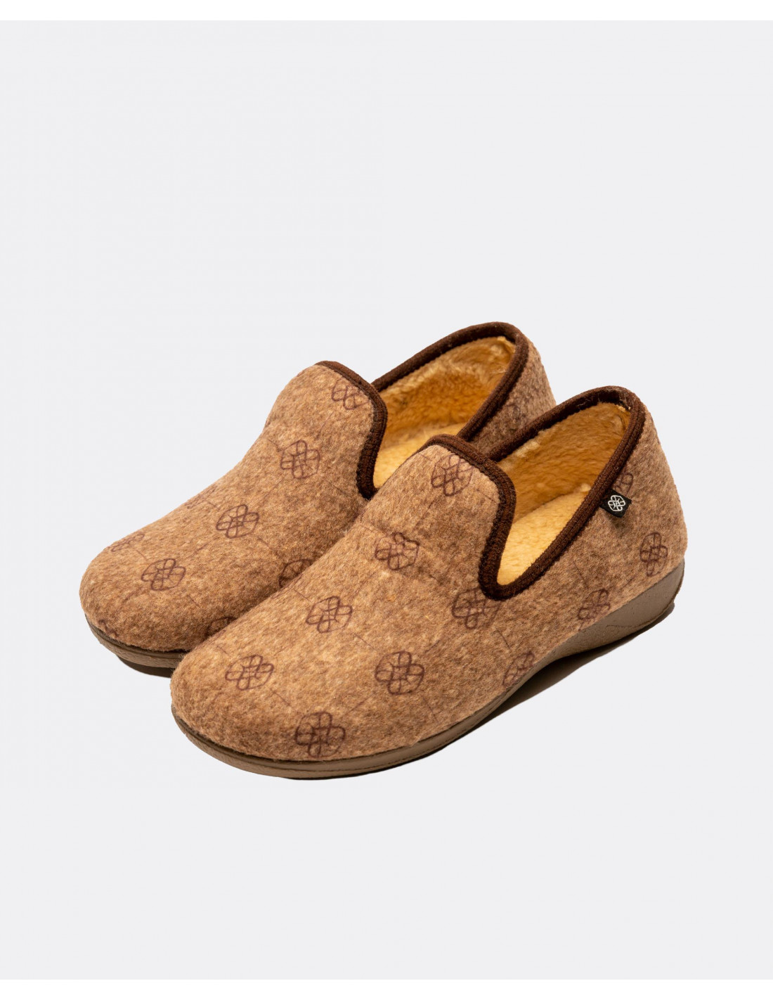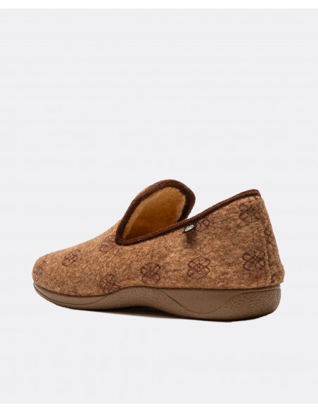 Zapatillas cerradas de estar por casa en color marróncon estamapdo de logos en color marrón. Diseñadas para proporcionar el máximo confort.