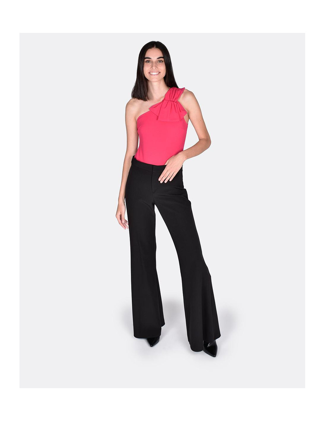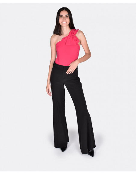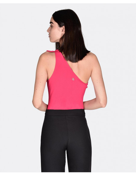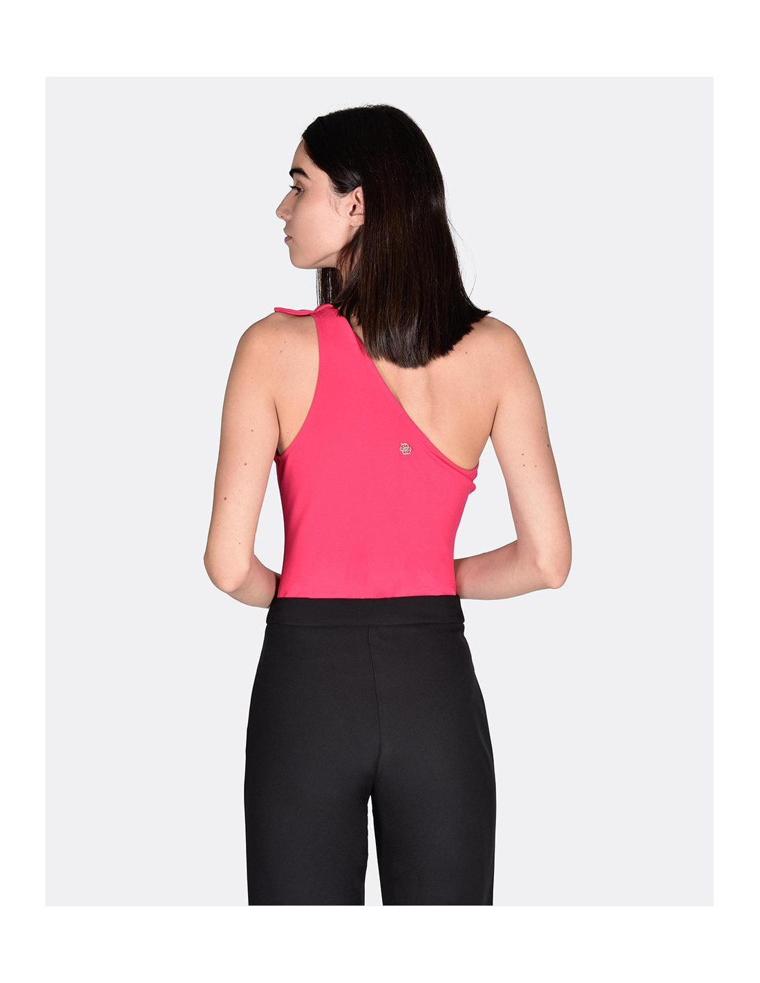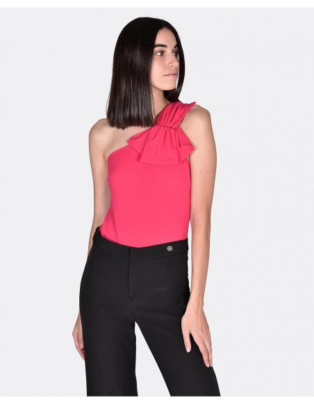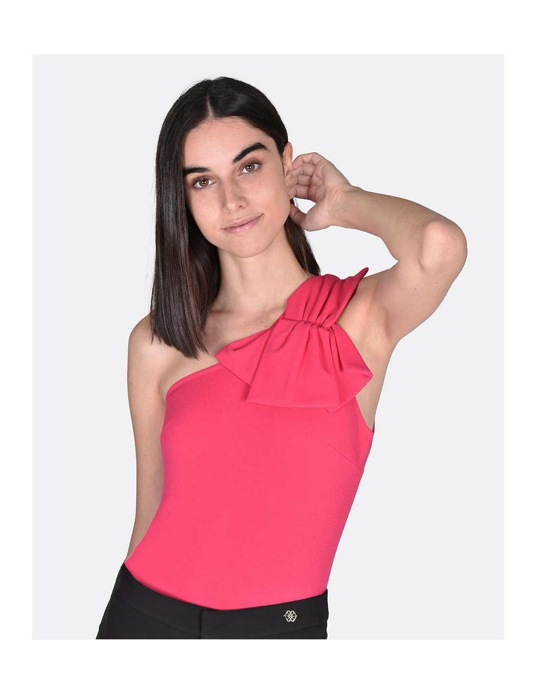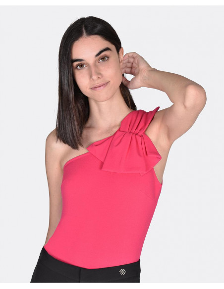 Body fucsia elástico cenido completamente a la figura. Destaca por su cuello asimétrico con gran lazada en el hombro izquierdo. Fornitura Cuplé en color oro. Ensalza tu figura con una prenda sexy y femenina. Color: Fucsia Cuplé Collection. Modelo: Altura:
