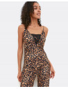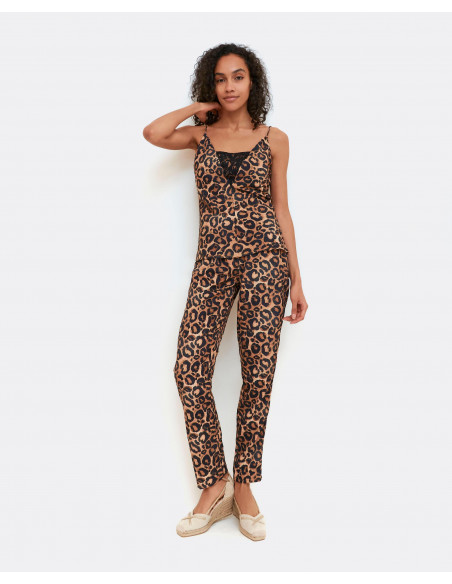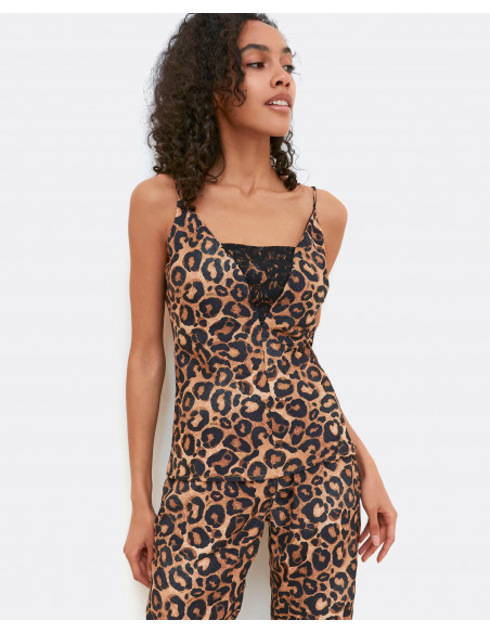 Top lencero de escote de pico realizado en estampado de leopardo con puntilla combina en contraste en el escote. Con tirantes finos ajustables. Top lencero, tallaje normal. Perfecto para tus looks de fiesta.