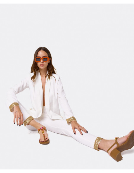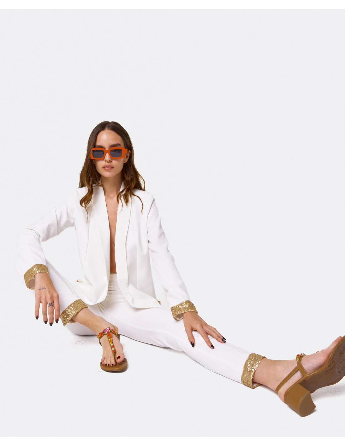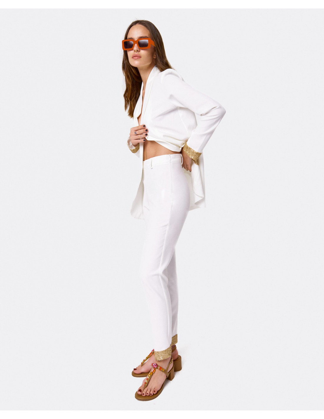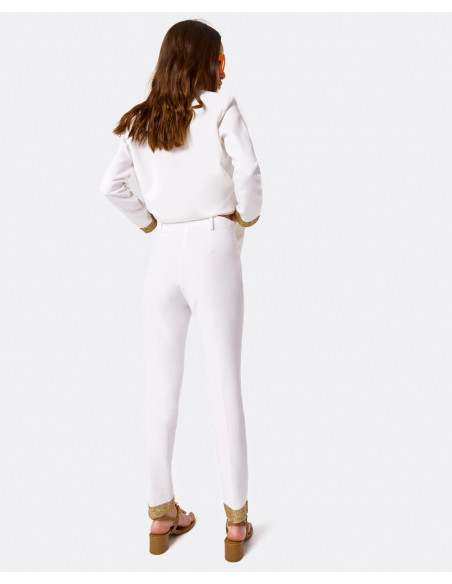 Pantalón de crep blanco y cintura alta que destaca por el bajo dorado de lentejuelas. Presenta pinzas en la parte delantera y trabillas para poder ponértelo con cinturón. Cierre con cremallera oculto en el lateral. Crea un un total look con la americana Lola a juego. La modelo de la imagen mide 1'69 y lleva una talla S.