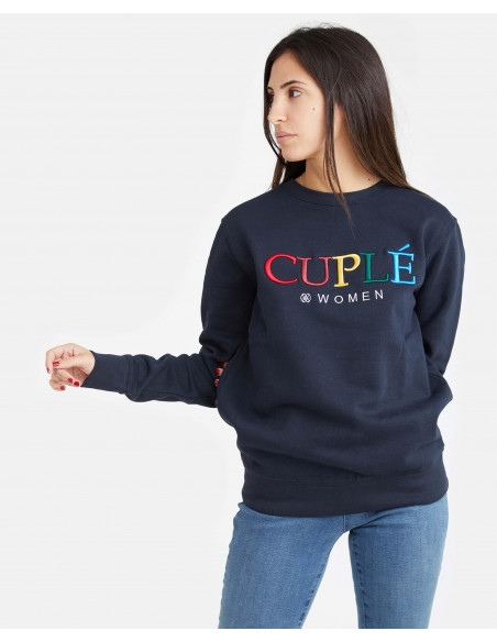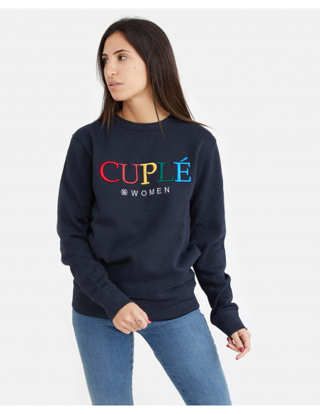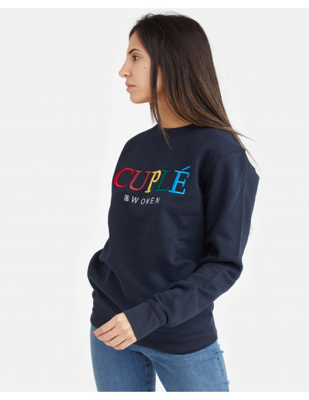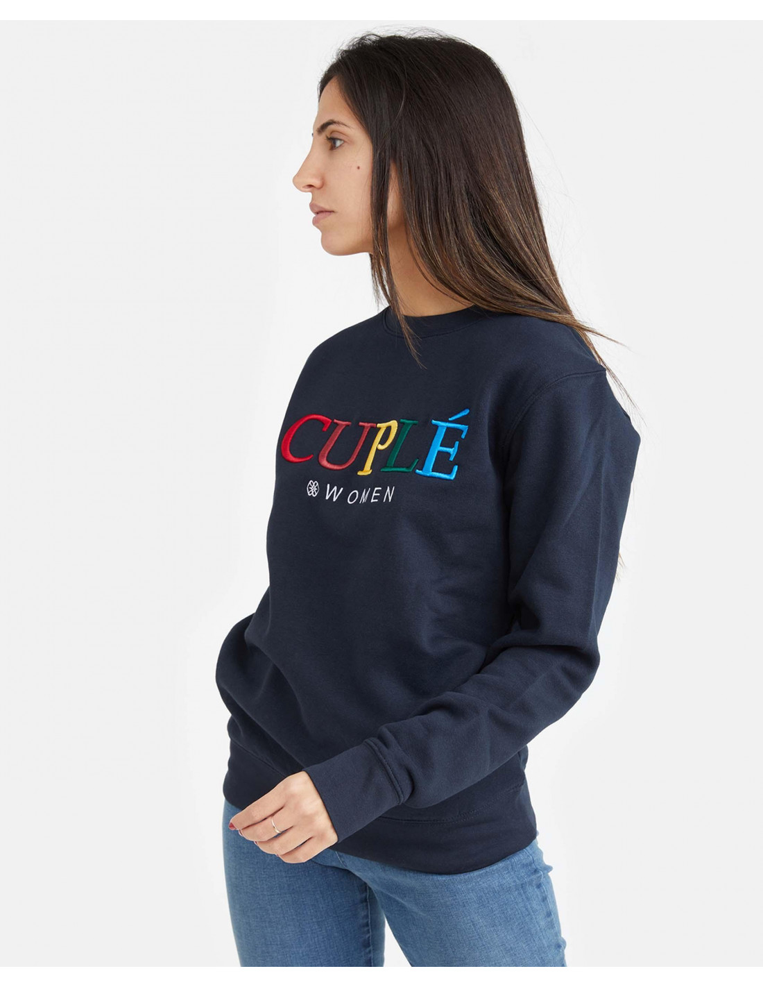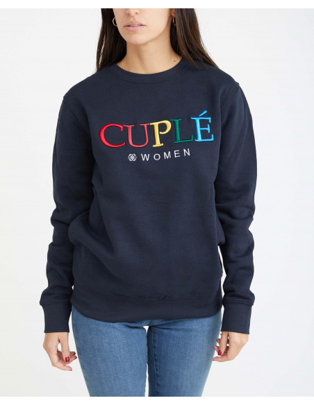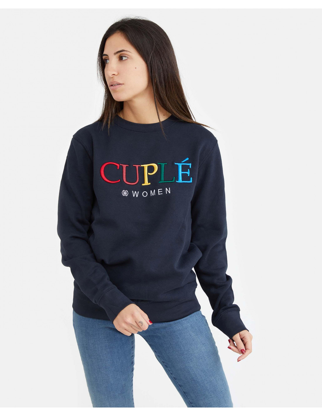 Sudadera algodón en color azul marino de cuello redondo. Nombre de marca bordada en la zona del pecho en multicolor.