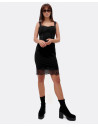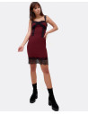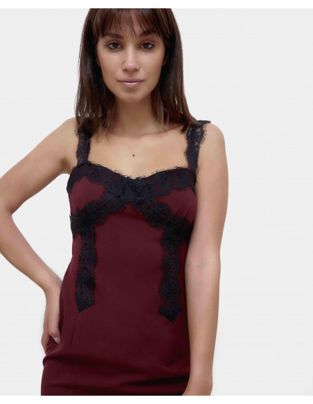 Vestido crep elástico de corte midi en color burdeos. Con escote en forma de corazón. Detalles de encaje negro en el bajo y en el pecho, así como en los tirantes del vestido. Perfecto para estas fiestas.