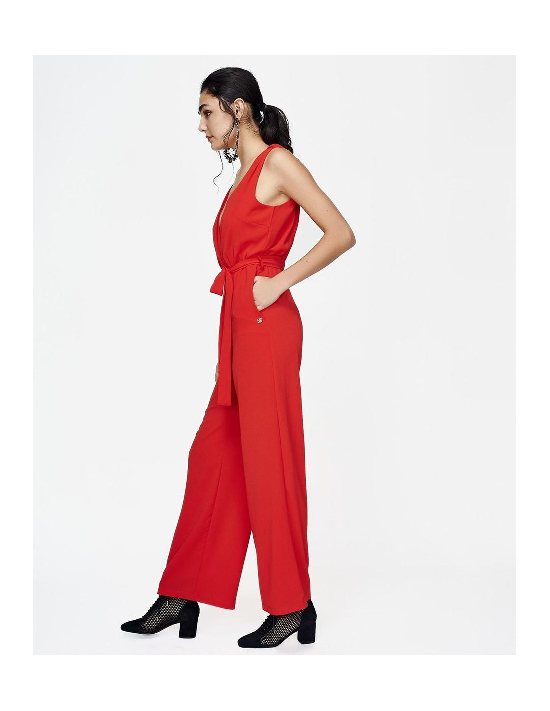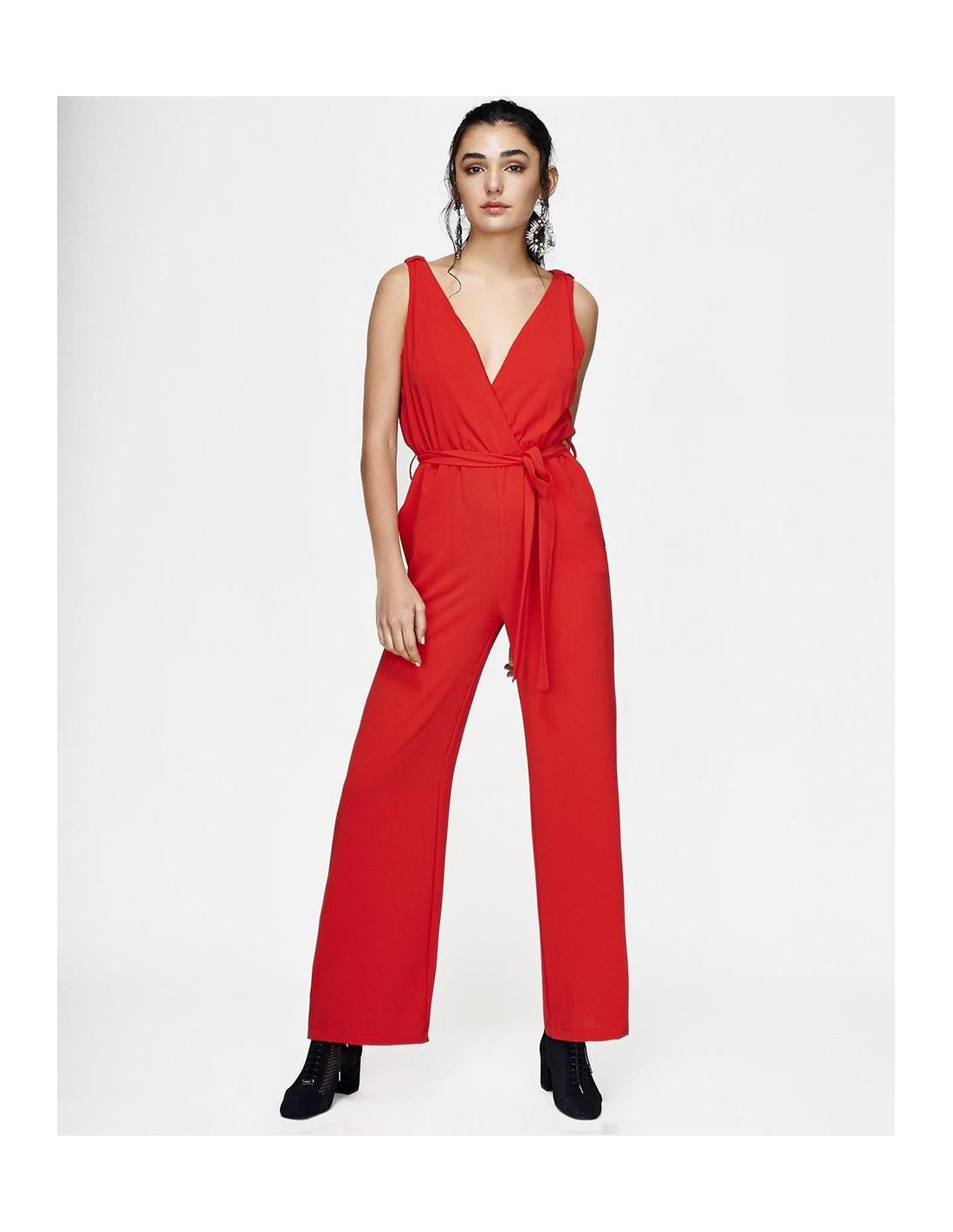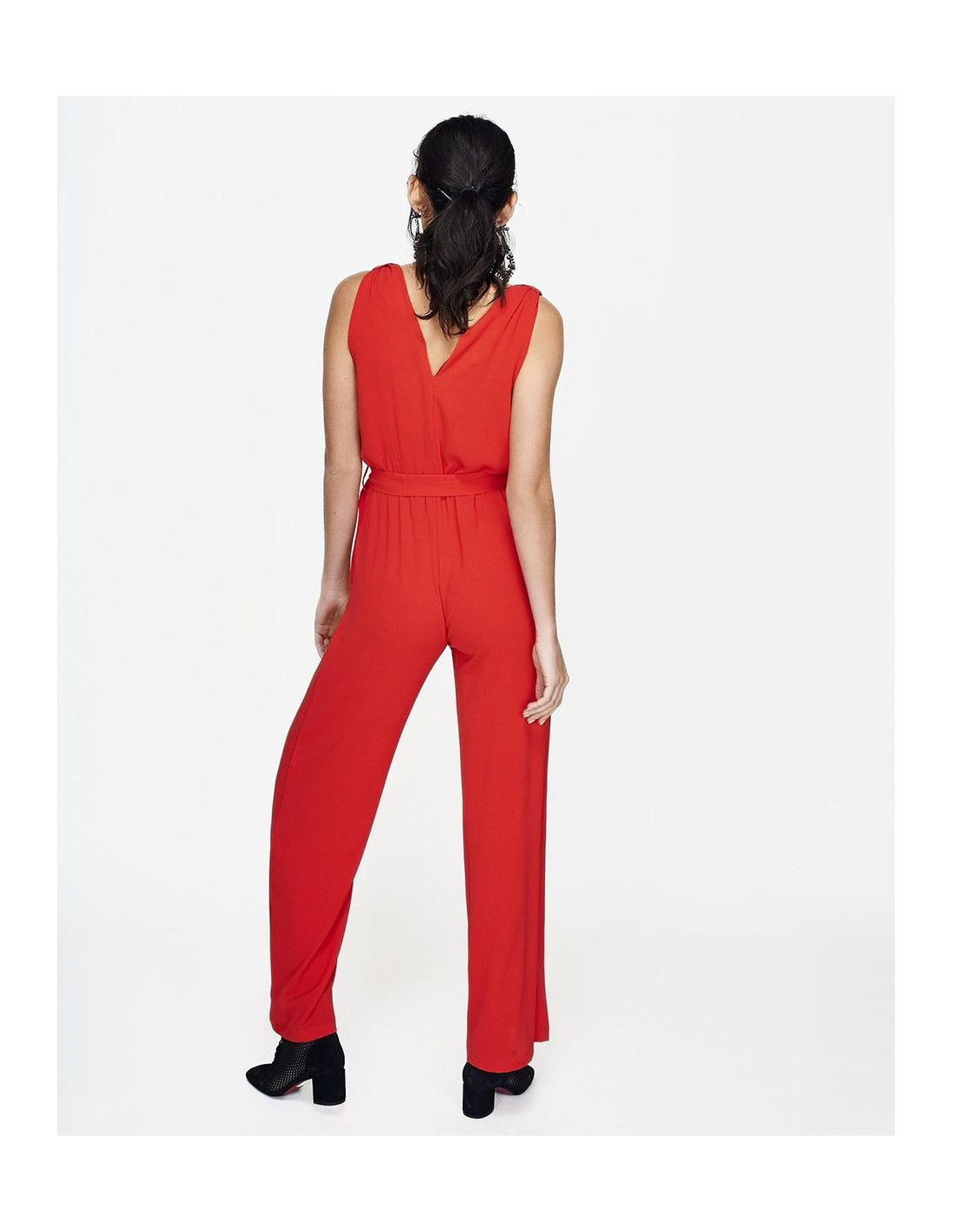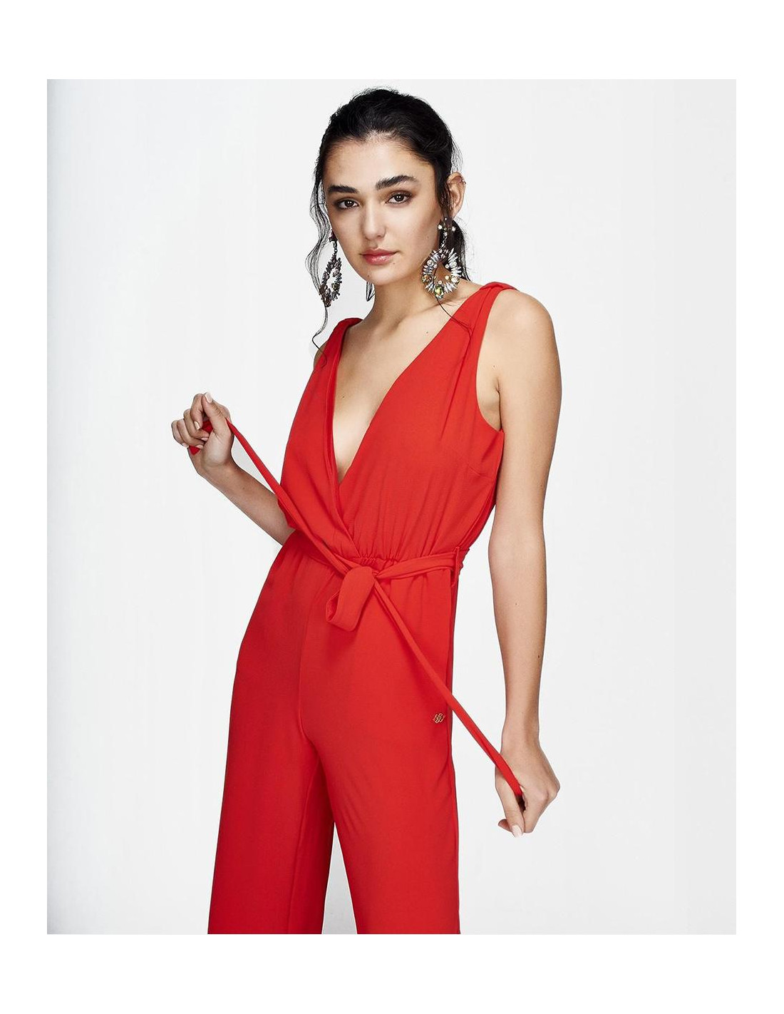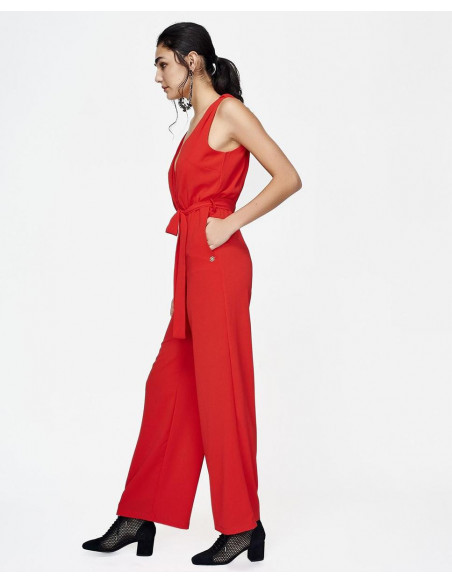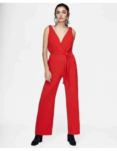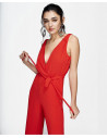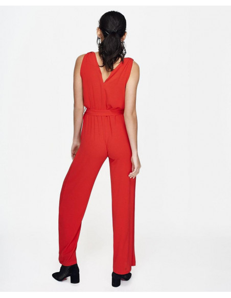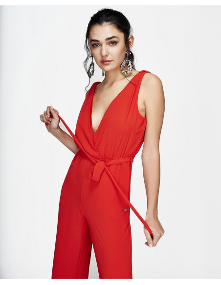 Mono CUPLÉ de gasa rojo. Tiene un escote en pico cruzado drapeado de tirante ancho. Presenta una lazada a la cintura marcando la figura de manera elegante, con detalle de botón en la espalda. Tiene un largo hasta los pies. Medidas: Altura: 1,79 cms. Pecho