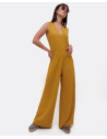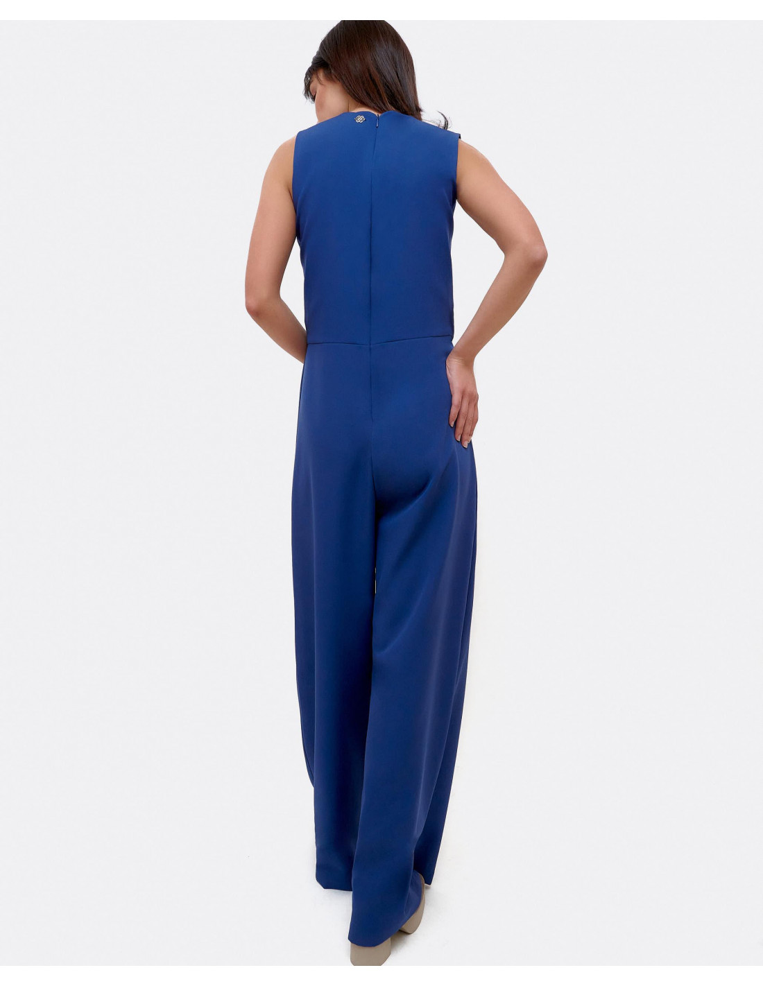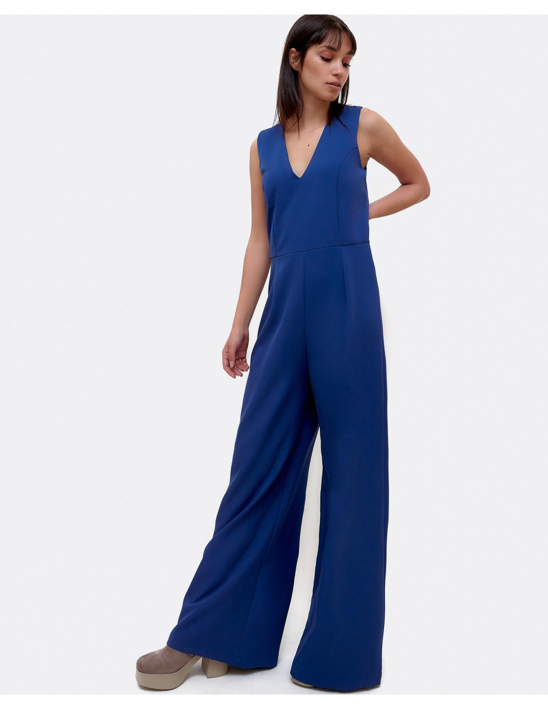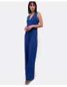 Mono de pata ancha elaborado en crep azul, con detalle de escote en forma de V y ligeramente ajustado en la cintura, para definir y estilizar la figura. Perfecto para tu look de fiesta.