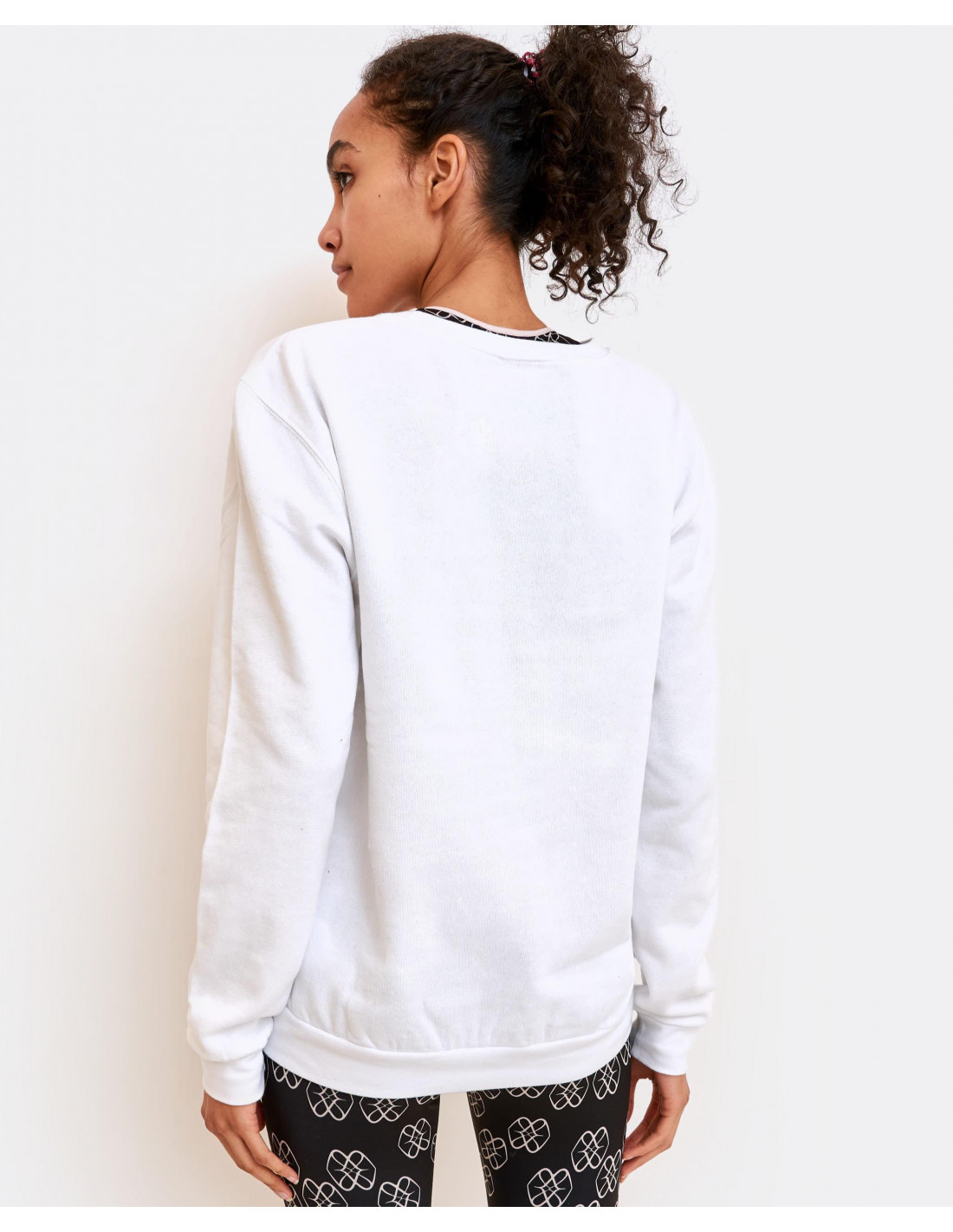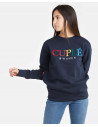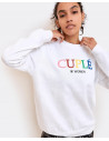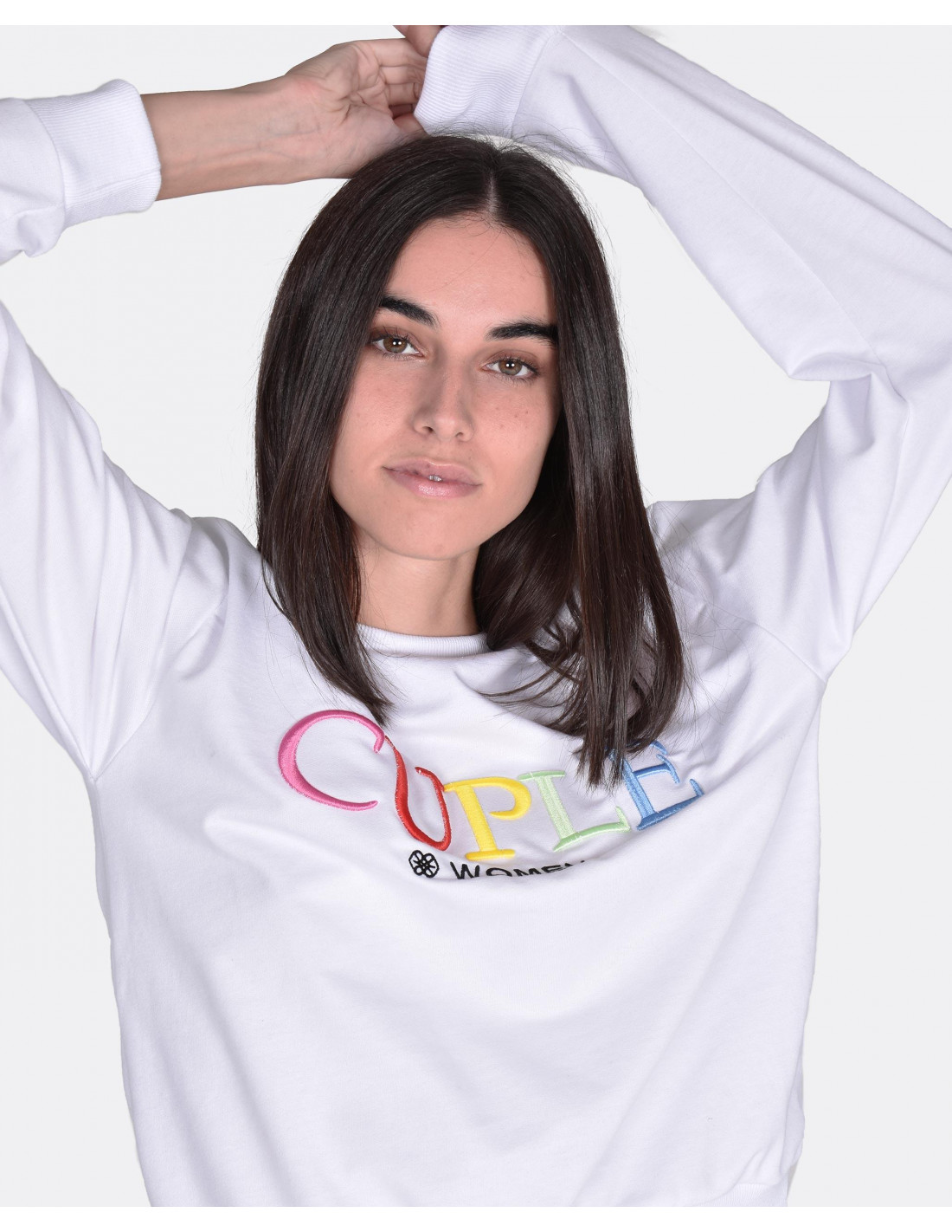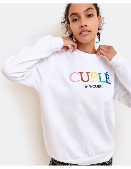 Sudadera blanca de punto con bordado multicolor con el logo de CUPLÉ. Perfecto para un look diario y puedes combinarlo con nuestra amplia gama de pantalones. La modelo mide 1'71 y lleva una talla S.