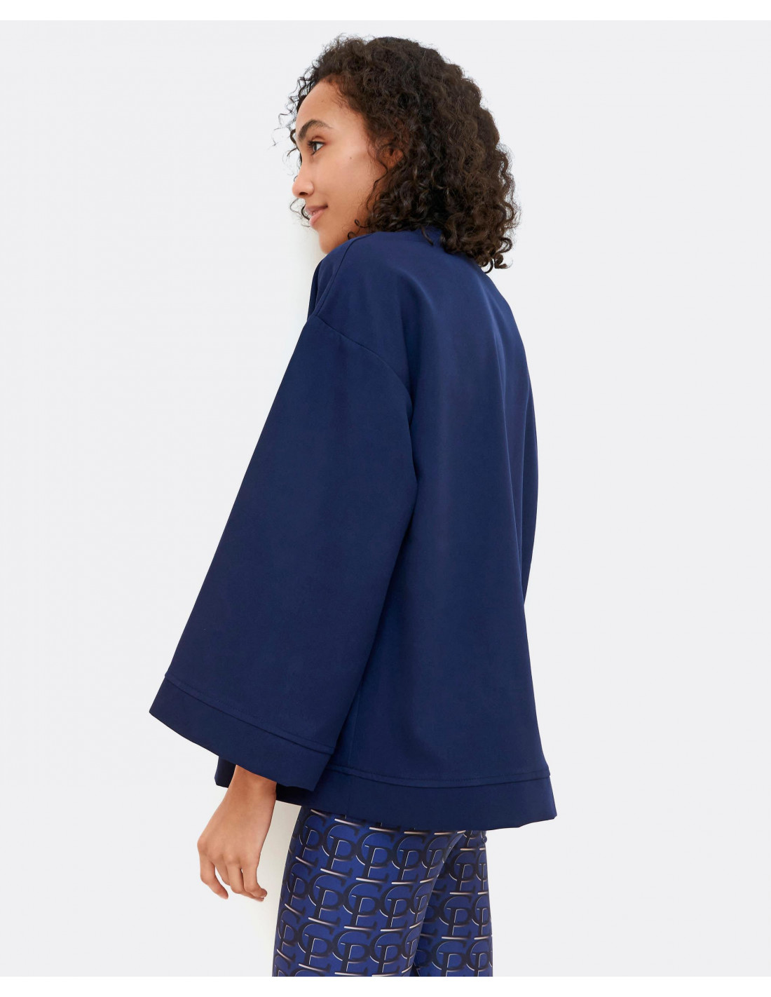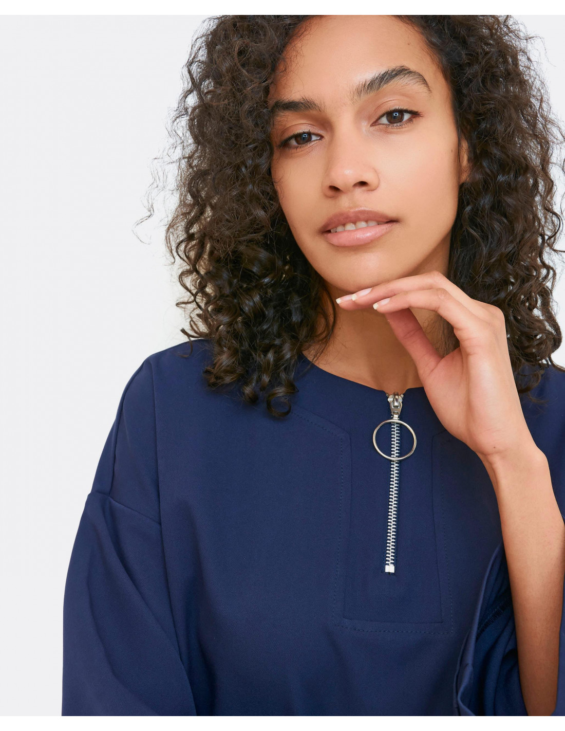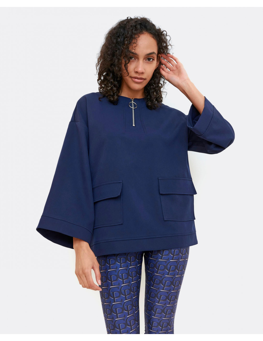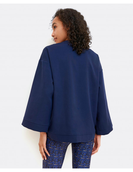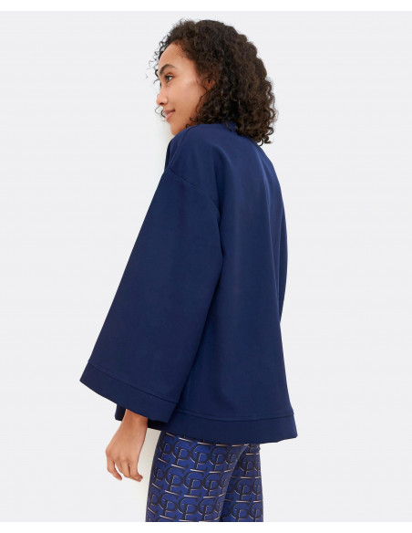 Sudadera de tejido de crep en color azul marino, con detalle de bolsillos en el delantero y cremallera en el escote, y mangas anchas. Te aconsejamos coger tu talla.