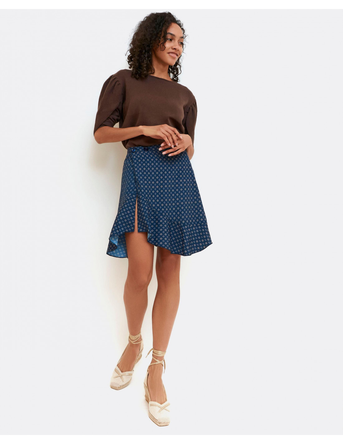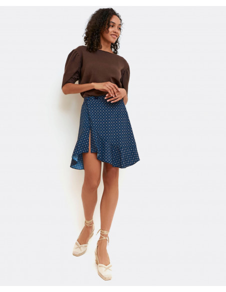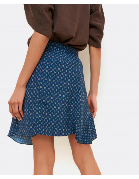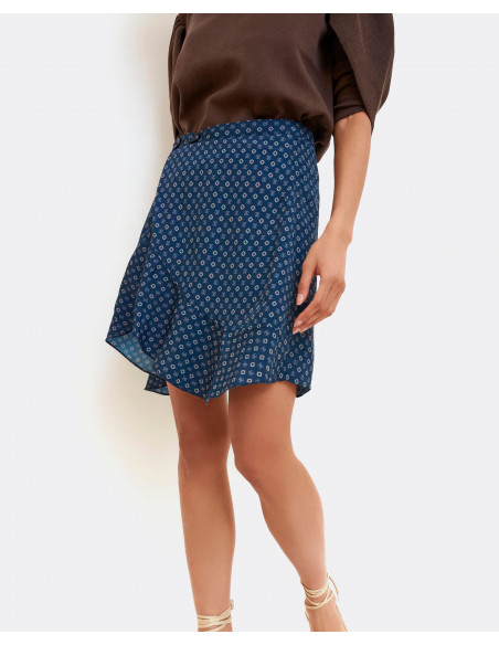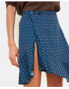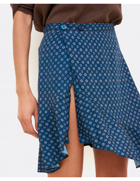 Falda con estampado corbatero y de corte de tiro alto, bajo asimétrico y cierre tipo pareo con dos botones. La falda tiene un tallaje normal.