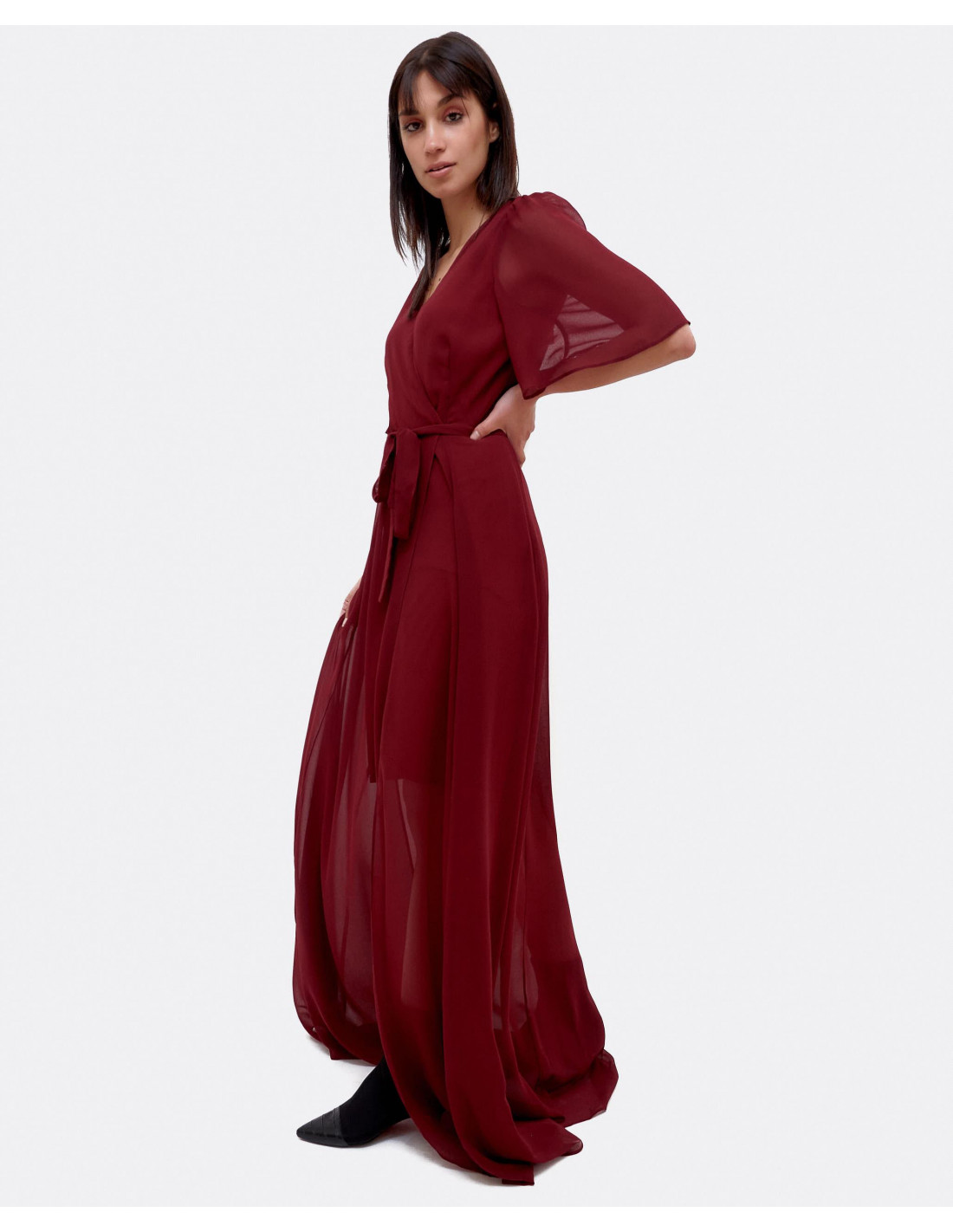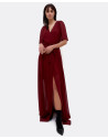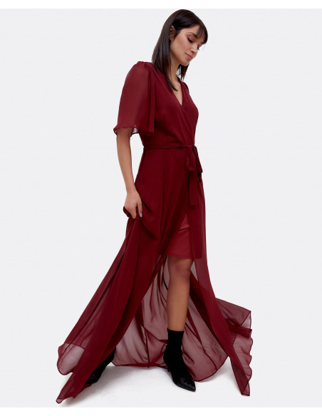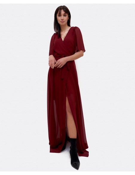 Vestido maxi elaborado en gasa granate, con detalle de apertura en la pierna. Escote en forma de V. Manga corta.