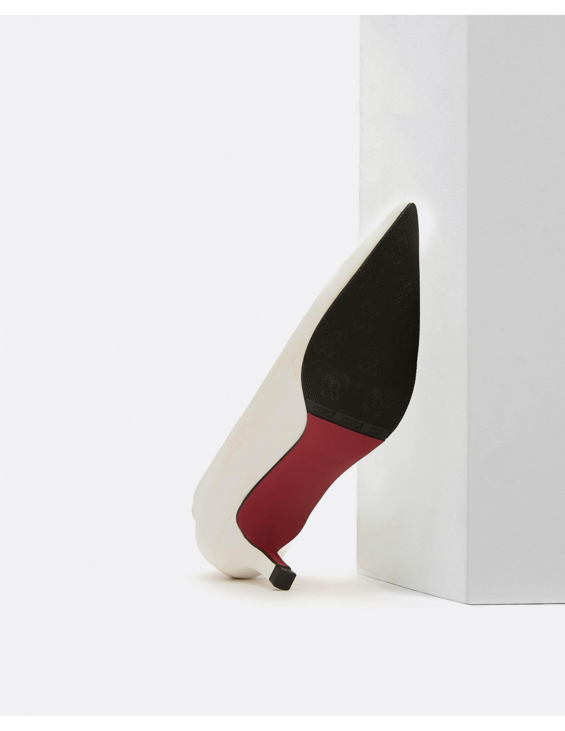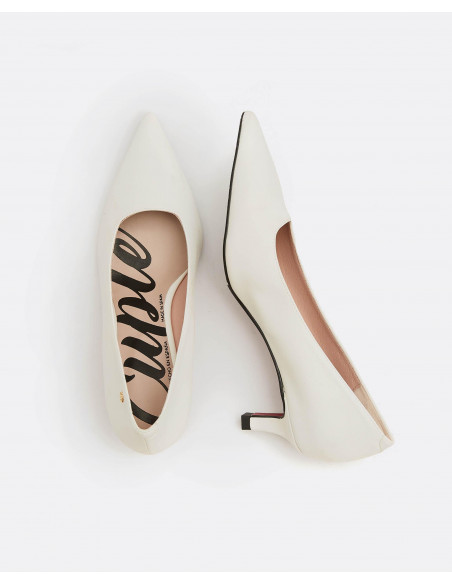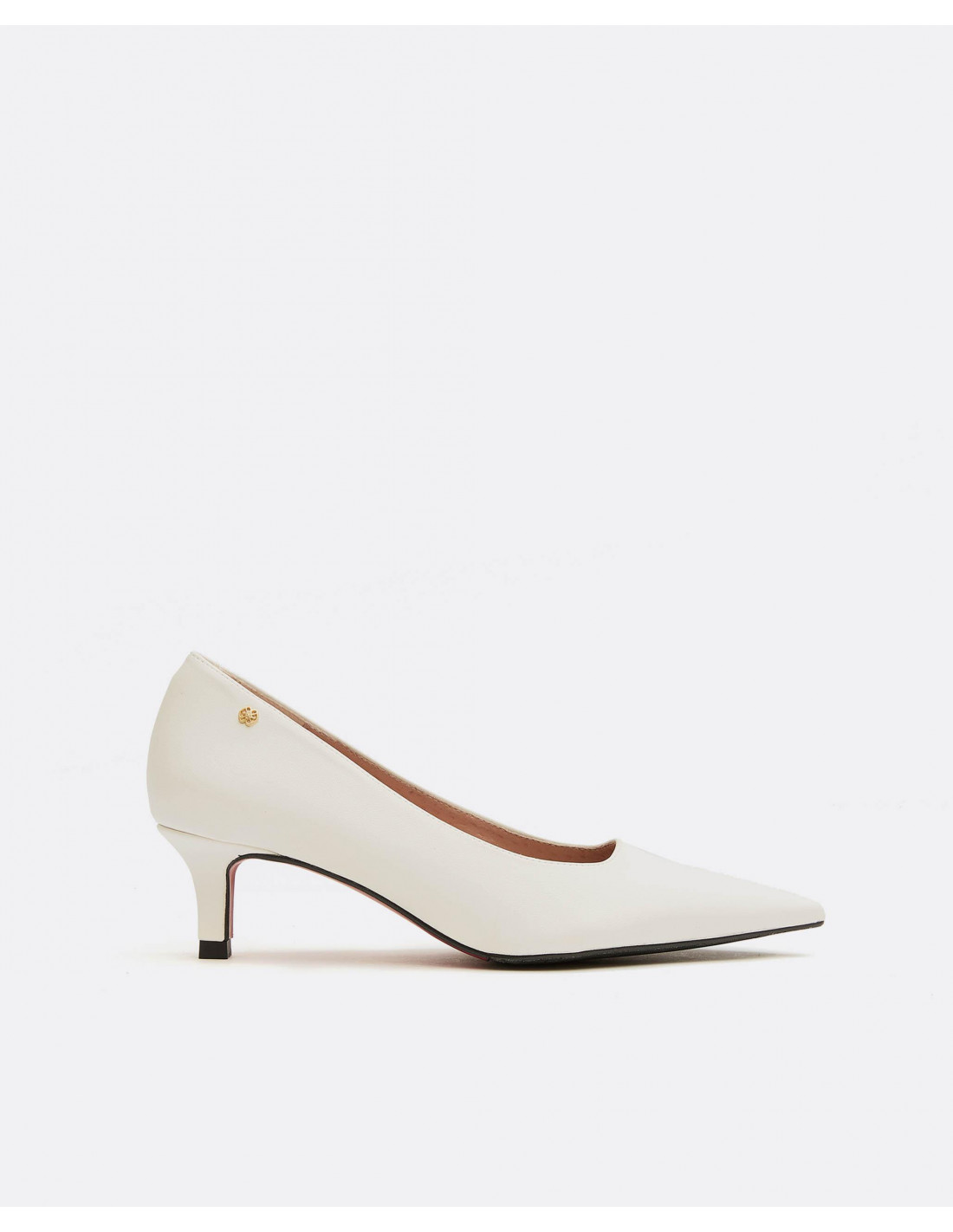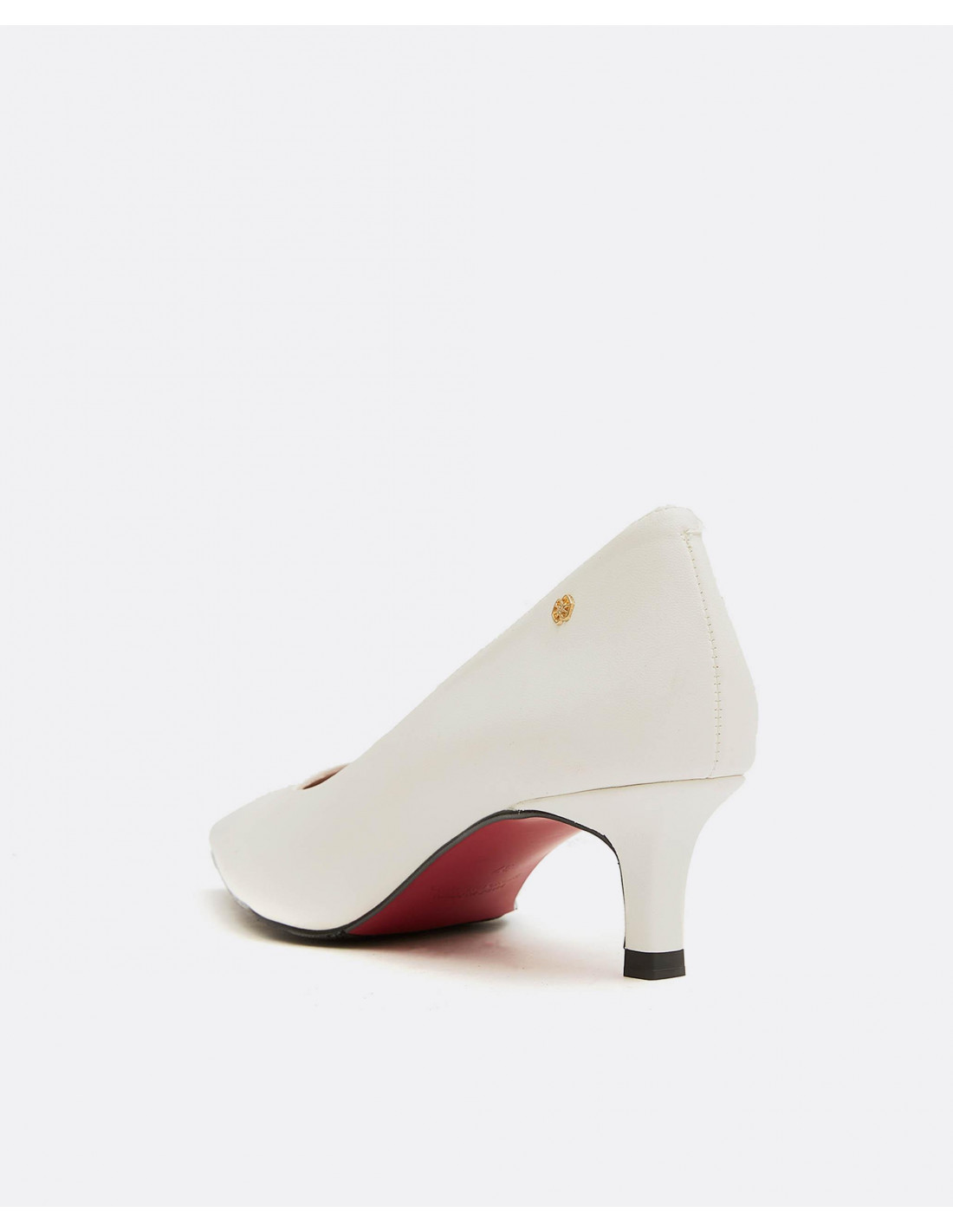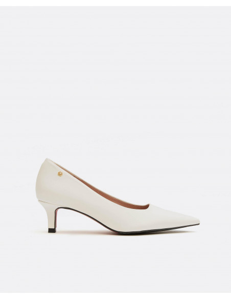 Salones elaborados en material de tecnopiel en color blanco. De punta de pico con tacón bajo. De color básico para complementar todos tus looks.