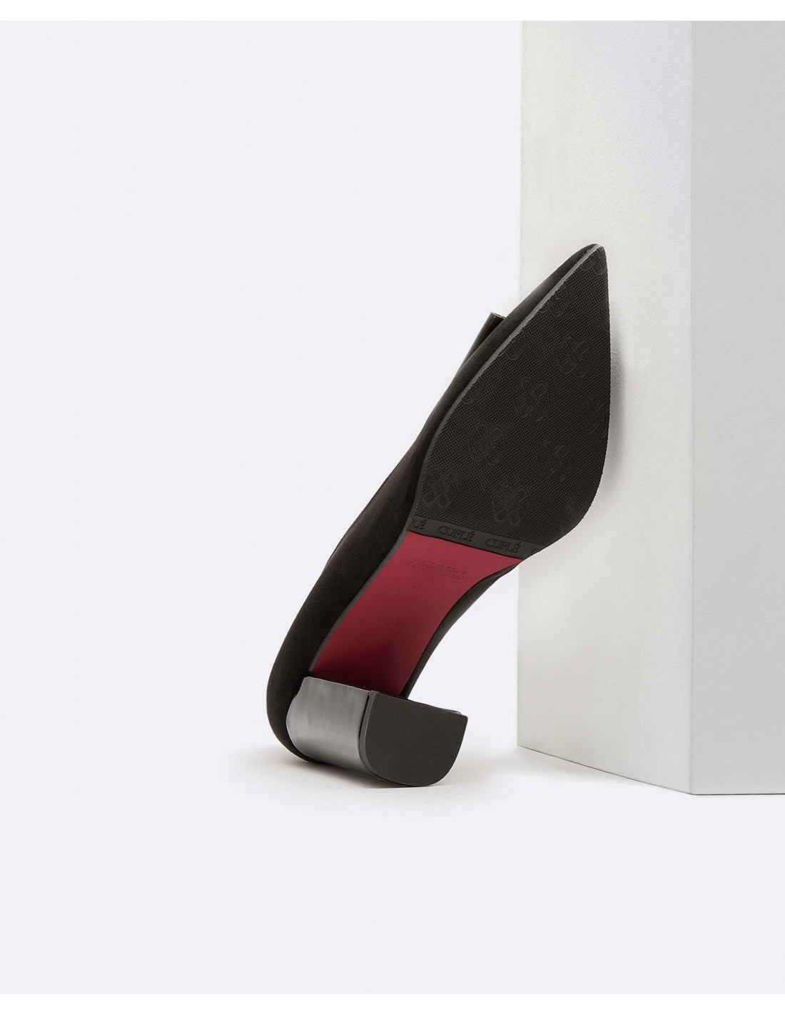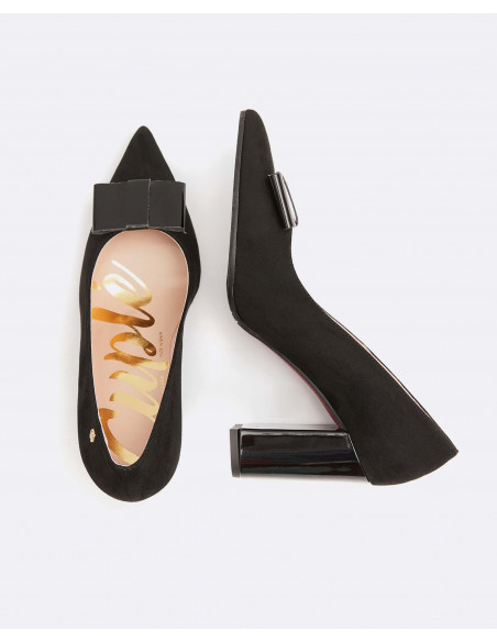 Salones confeccionados en material de ultrasuede en color negro. De punta de pico con tacón cuadrado alto. Combínalo con cualquier look para darle un toque elegante y chic.