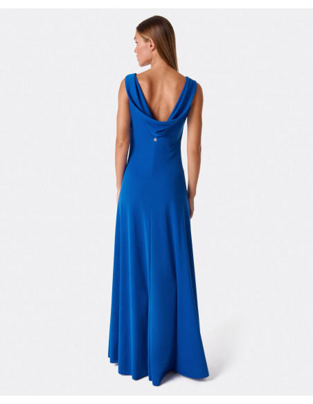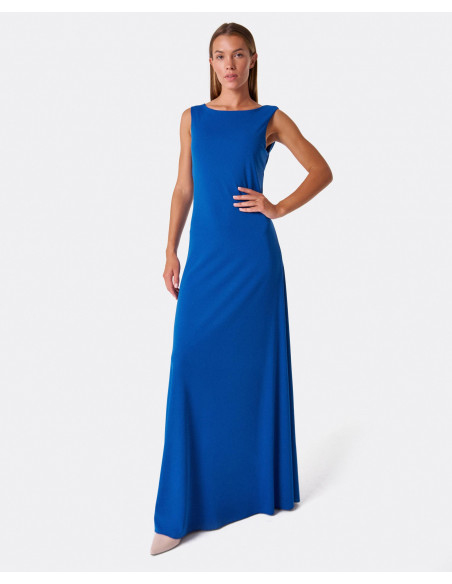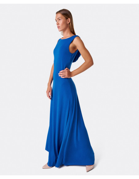 Vestido azul, de punto fino y caida hasta los pies. Su fluidez hace que resulte muy cómodo y su original escote en la esalda le dan un toque de personalidad y lo convierte en una pieza genial para el verano.