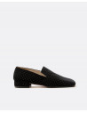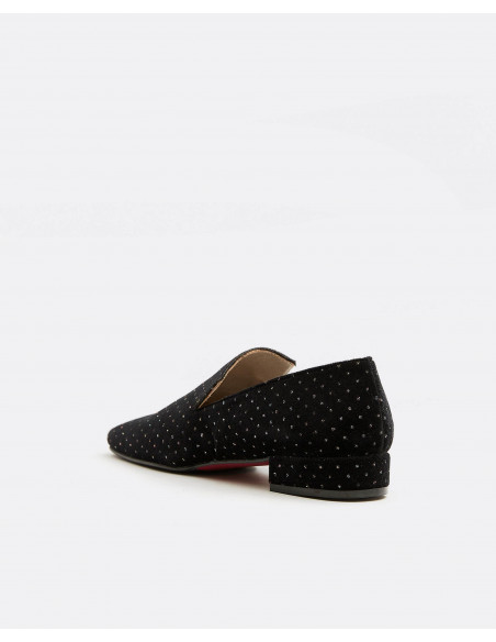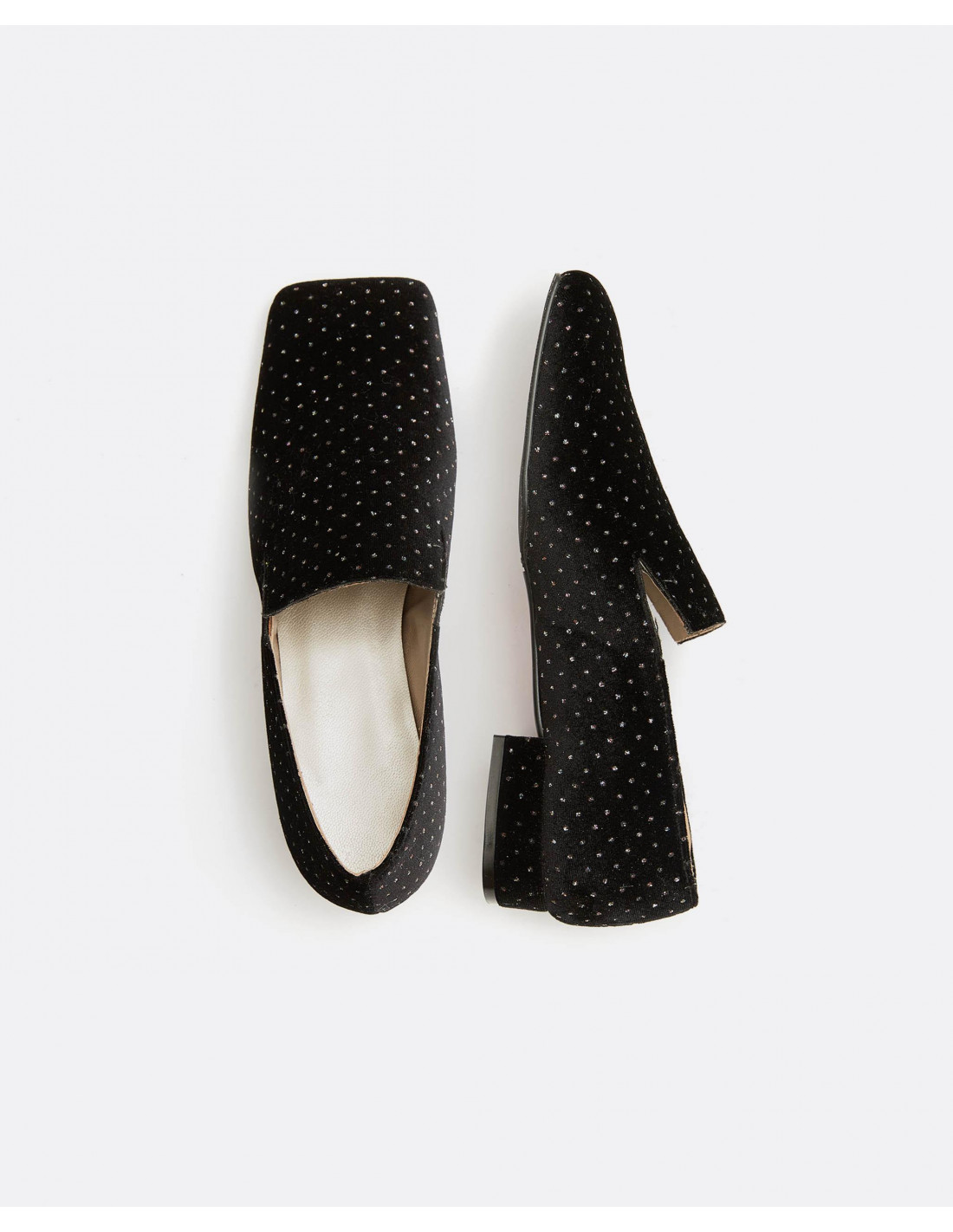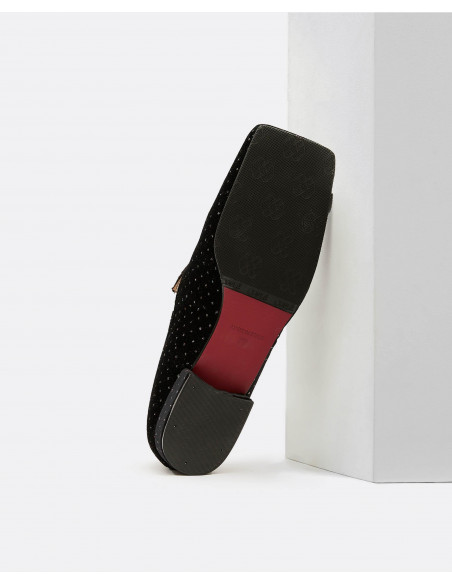 Mocasín de tipo slipper de punta cuadrada. Hecho en terciopelo de color negro con mini apliques brillantes. Puedes combinarlo con nuestro bolso a juego.