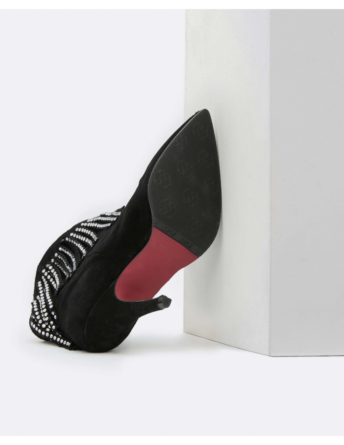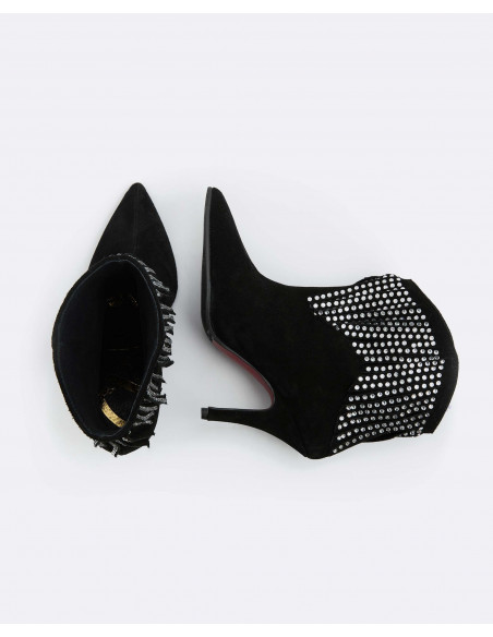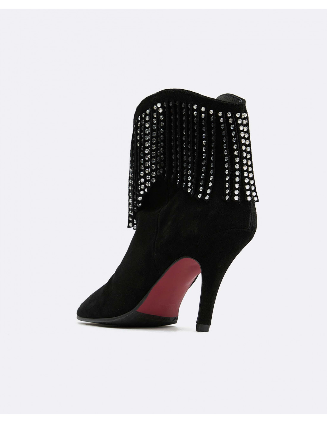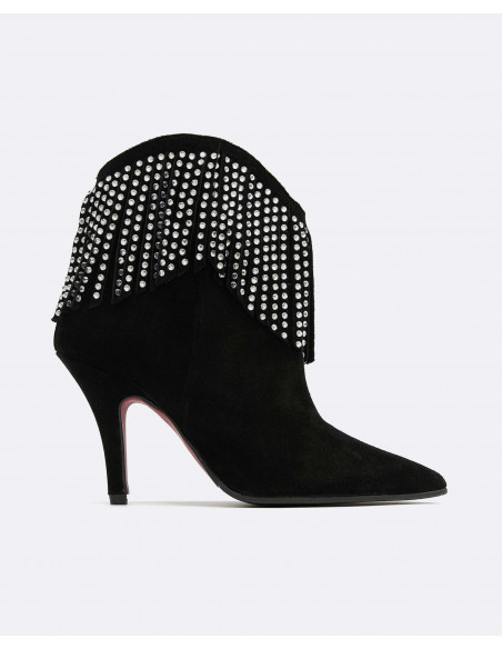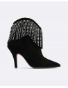 Botín de tacón fino y con punta fina. Detalle de flecos al tono con piedrecitas de color cristal. Perfectos para complementar y elevar tus looks de fiesta.