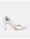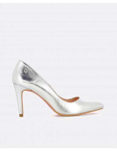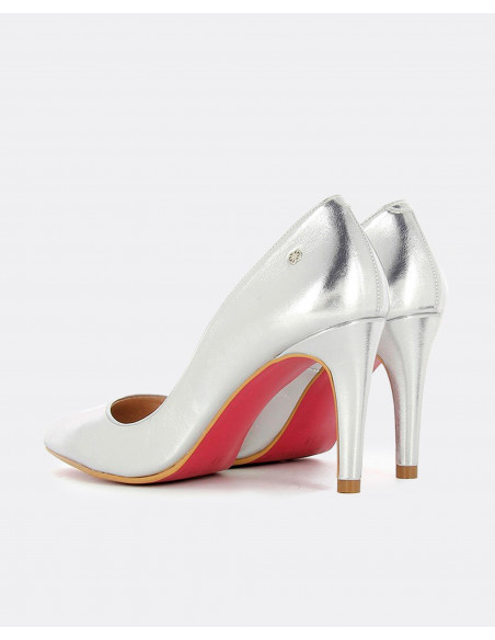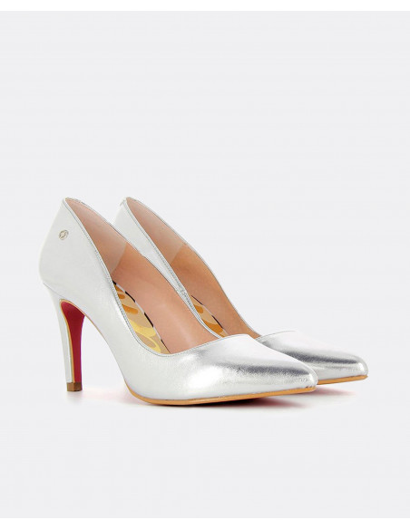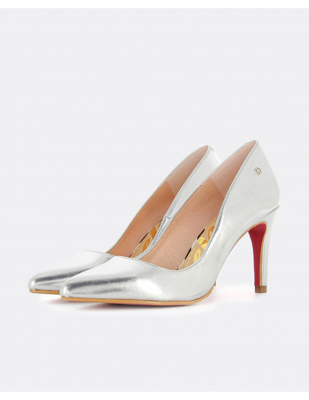 Salón plata lamé, acabado en punta y escote redondo. El salón más característico e icónico de Cuplé, destaca por su tacón alto y su suela fucsia Cuplé. Fornitura Cuplé en color oro. Tu salón joya. Color: Argento. Cuplé Collection. Altura del tacón 8 cm.
