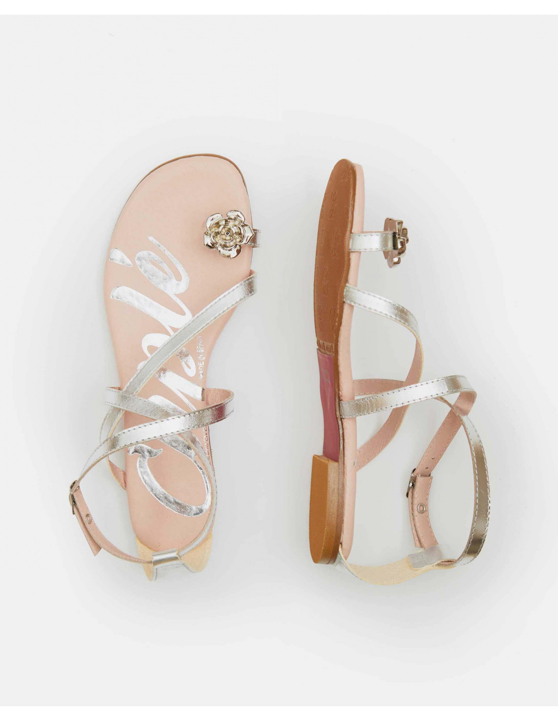 Sandalia napa con tiras metalizada playa y detalle brillante en la parte delantera sobre dedo. Suela y tacón color camel y hebilla trasera color plata sobre tira para mayor sujeción.