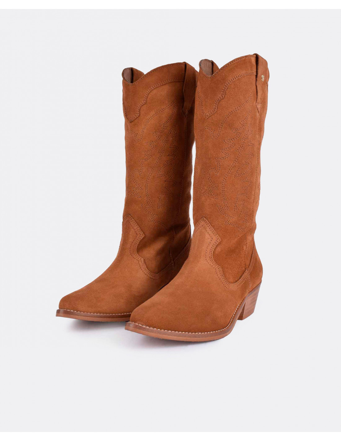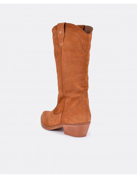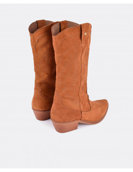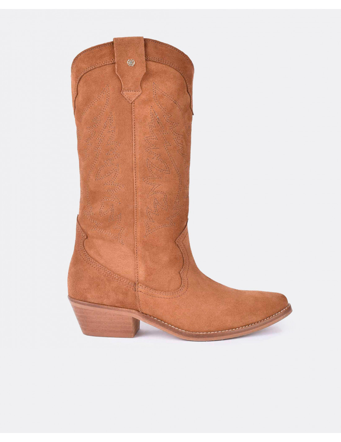 Las botas cowboy son un imprescindible esta temporada. Atrévete con estas botas de tacón bajo en serraje camel y salte de los tonos convencionales. Prueba a combinarlas con nuestra falda vaquera de volantes