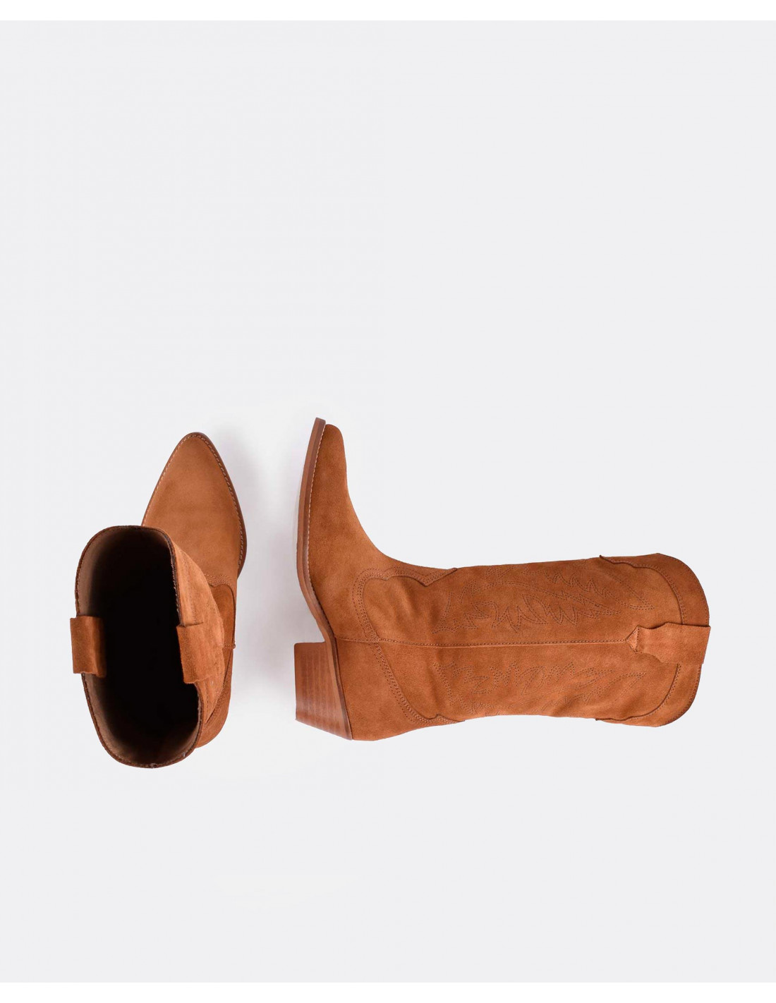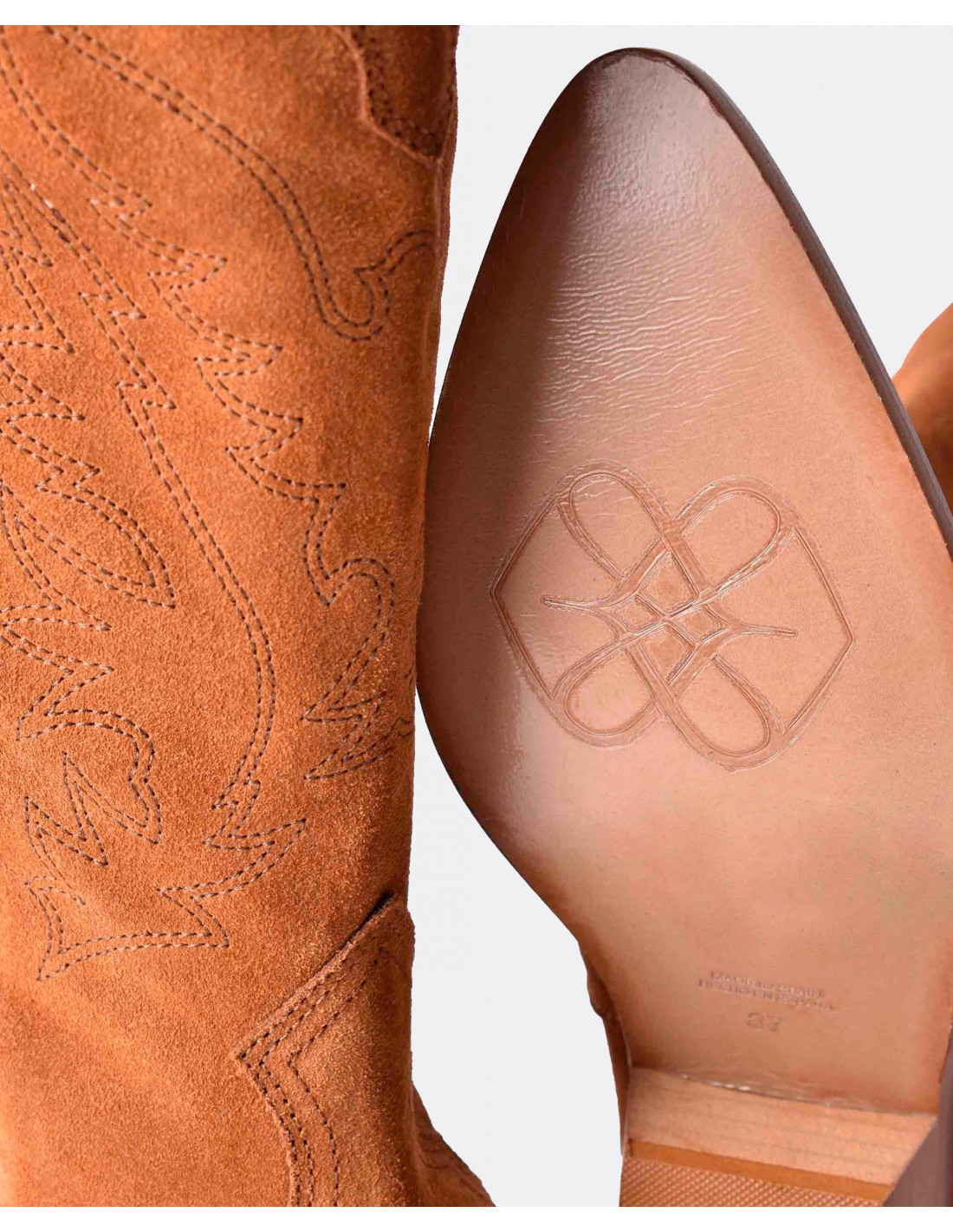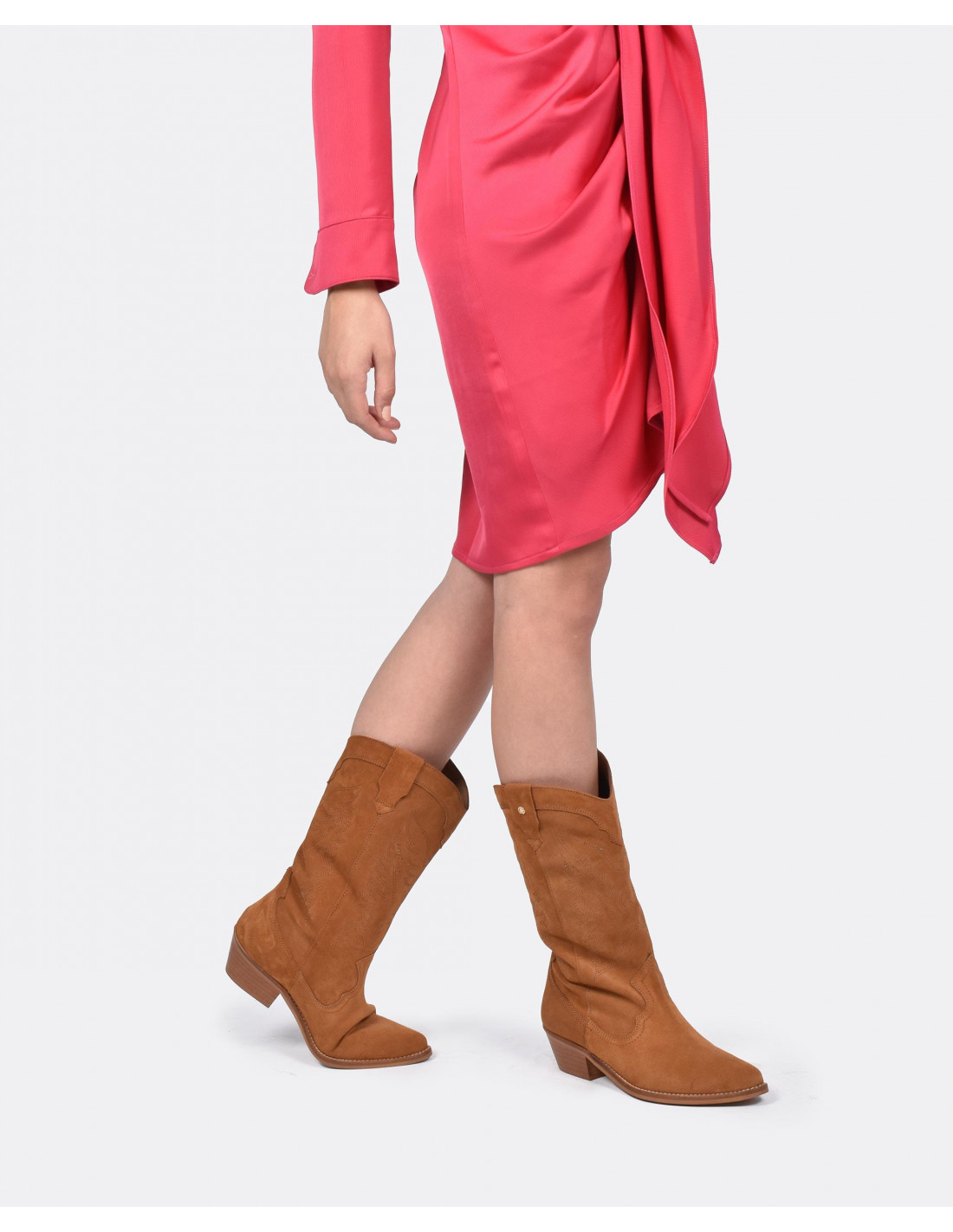 Las botas cowboy son un imprescindible esta temporada. Atrévete con estas botas de tacón bajo en serraje camel y salte de los tonos convencionales. Prueba a combinarlas con nuestra falda vaquera de volantes