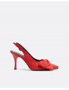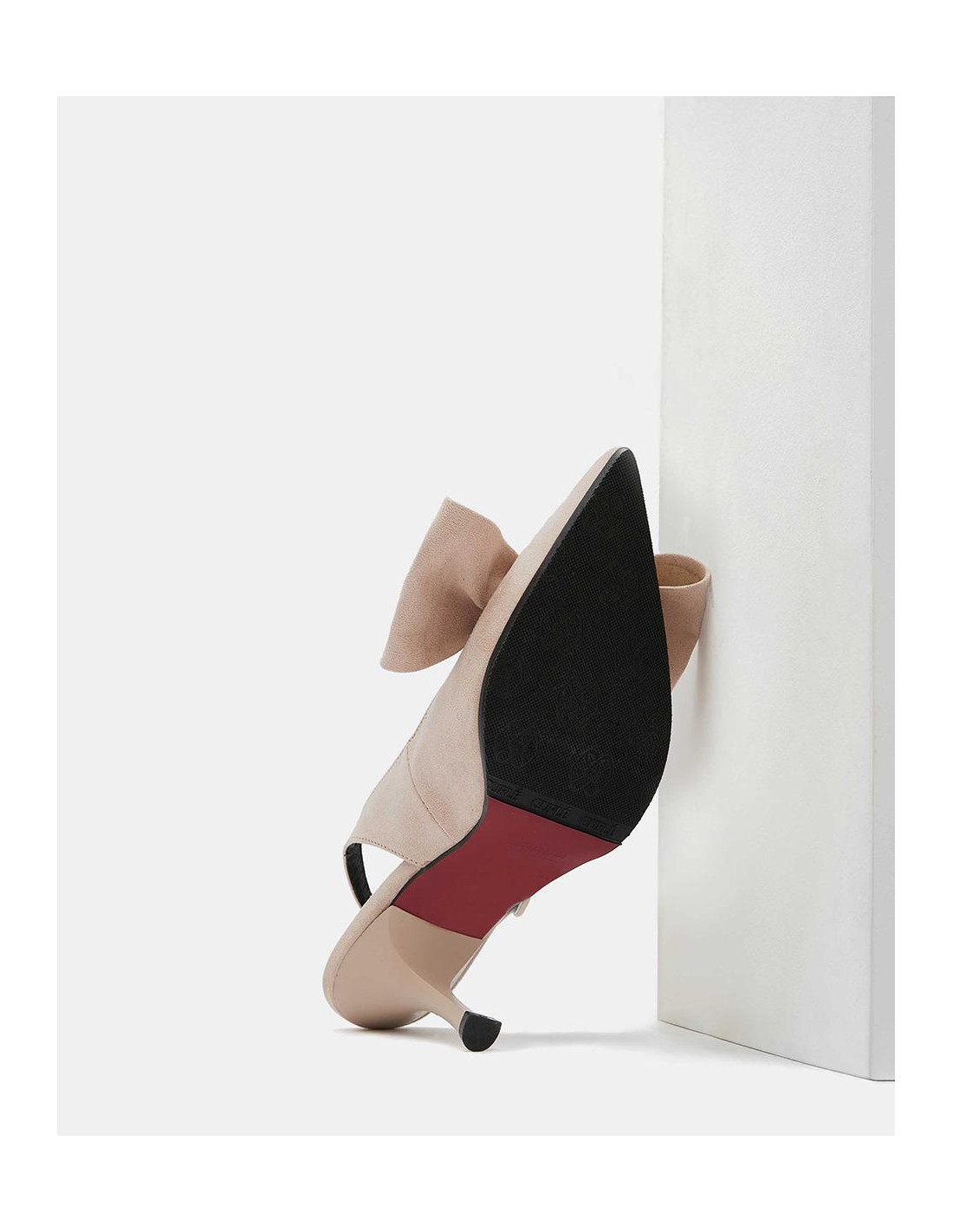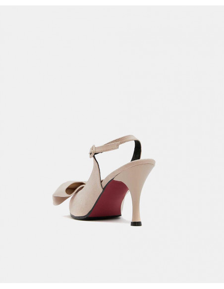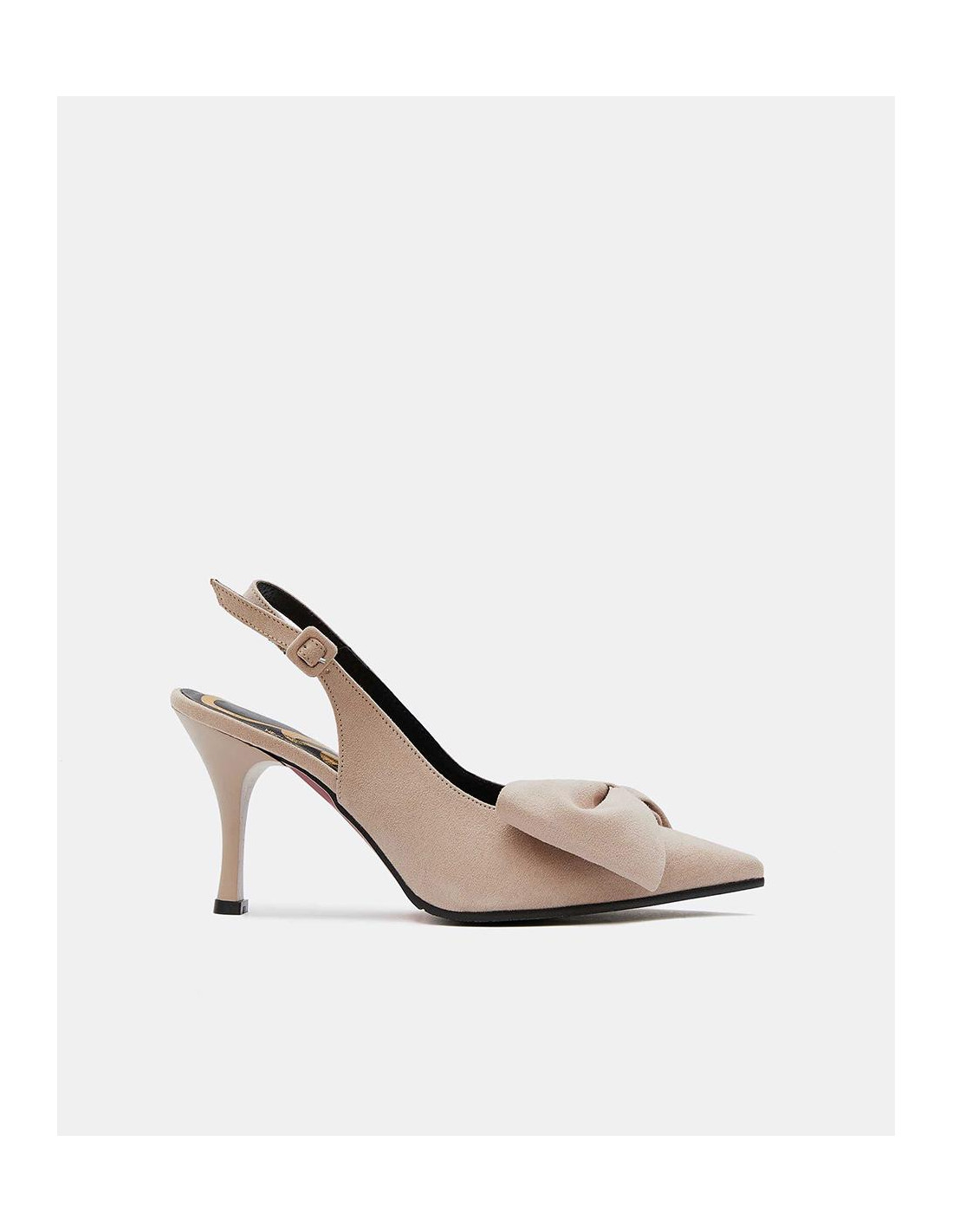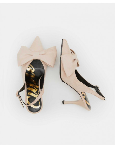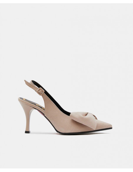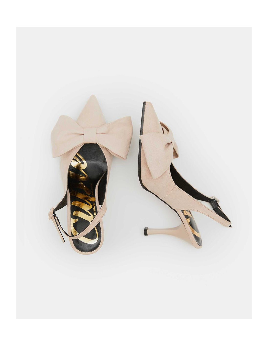 Salón napa beige destalonado con lazo. Cierre mediante hebilla en color dorado. Altura de tacón media.