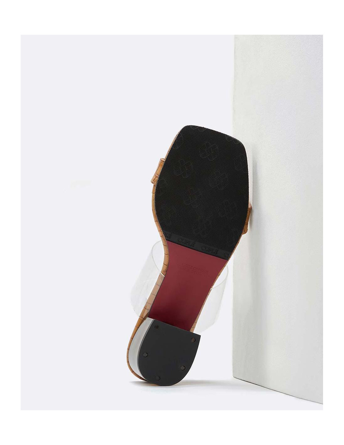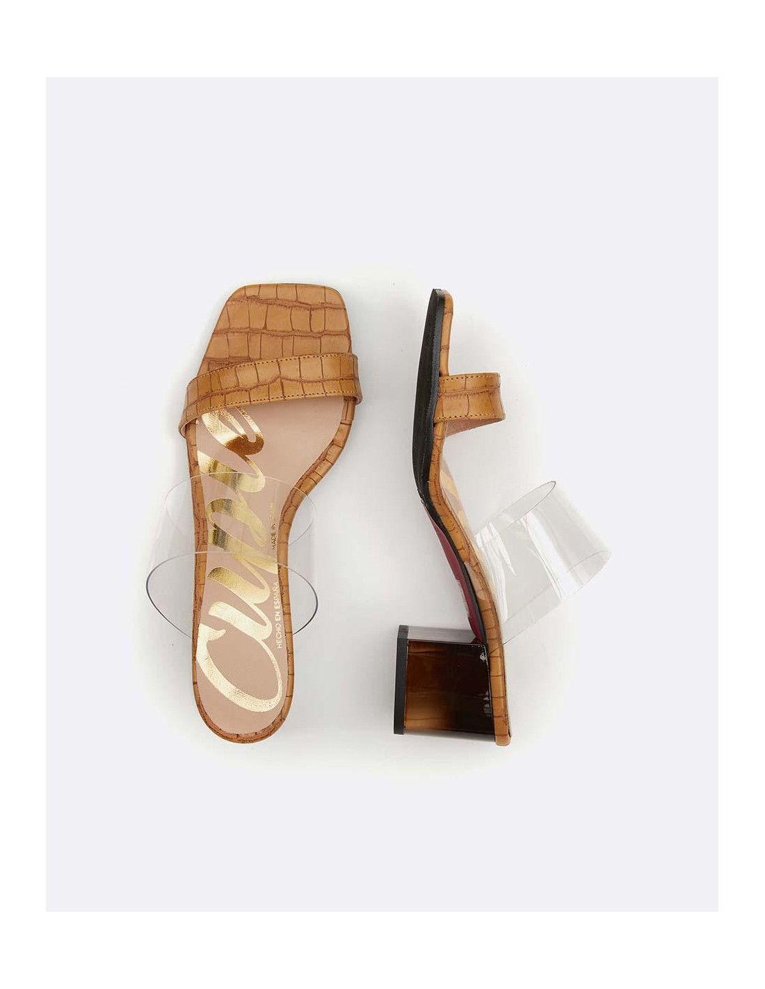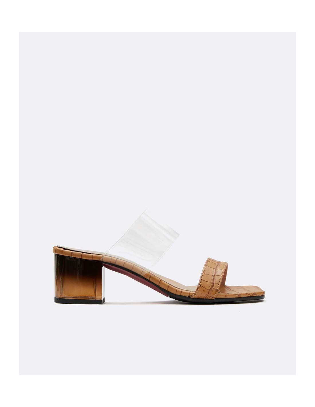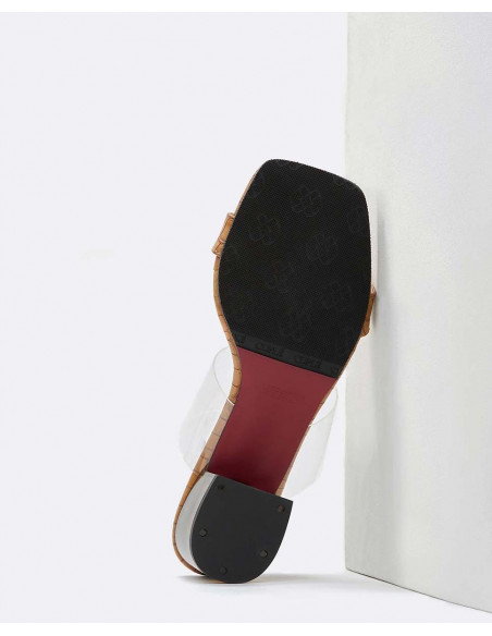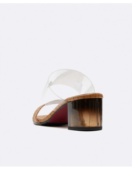 Zueco con cinta al empeine vinillo y estampado cocodrilo color marrón, tacón degradado colores negro y marrón, con punta cuadrada y tacón altura media. Perfectos para combinar con vestidos o faldas este verano.