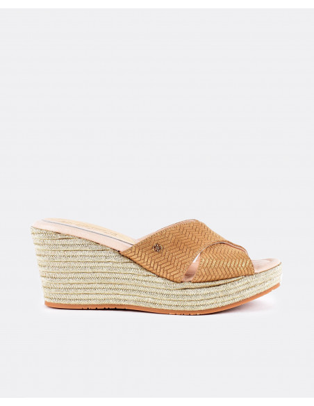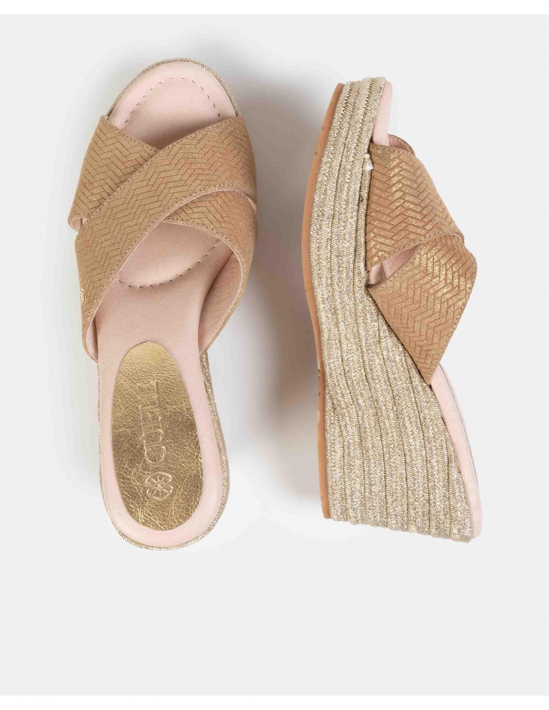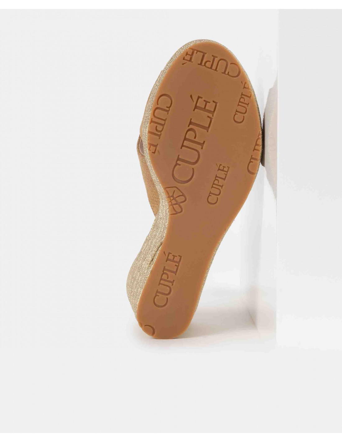 Cuña de plataforma pala con media altura, textura y color oro. Detalle lateral logotipo Cuplé y suela color camel. Proporcionando altura y comodidad a la vez.