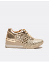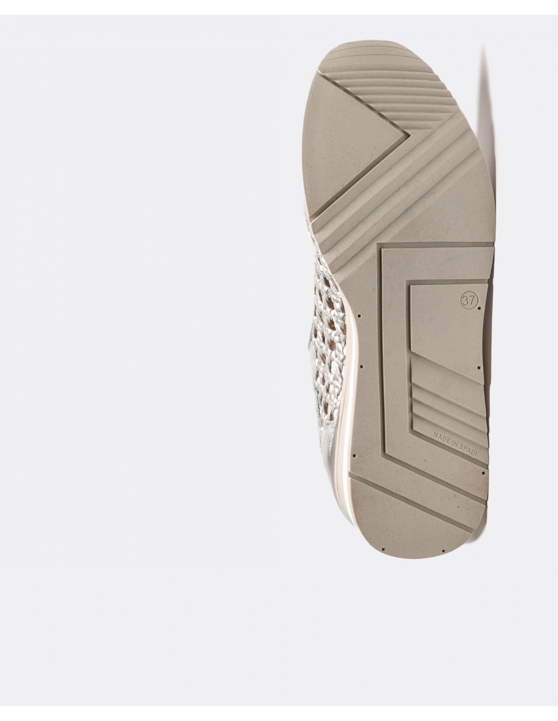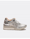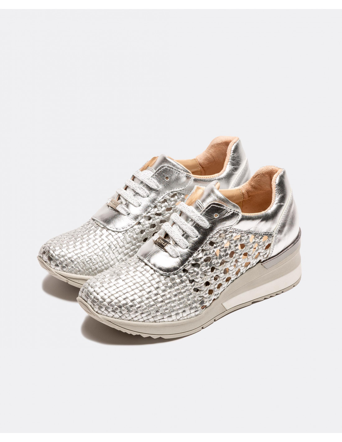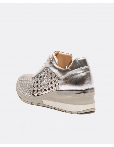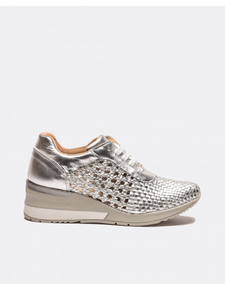 Deportivos plata con detalle trenzado. Con una plataforma en forma de tacón en color gris y blanco . Cierre mediante cordones grises. Ideales para dar un paseo.