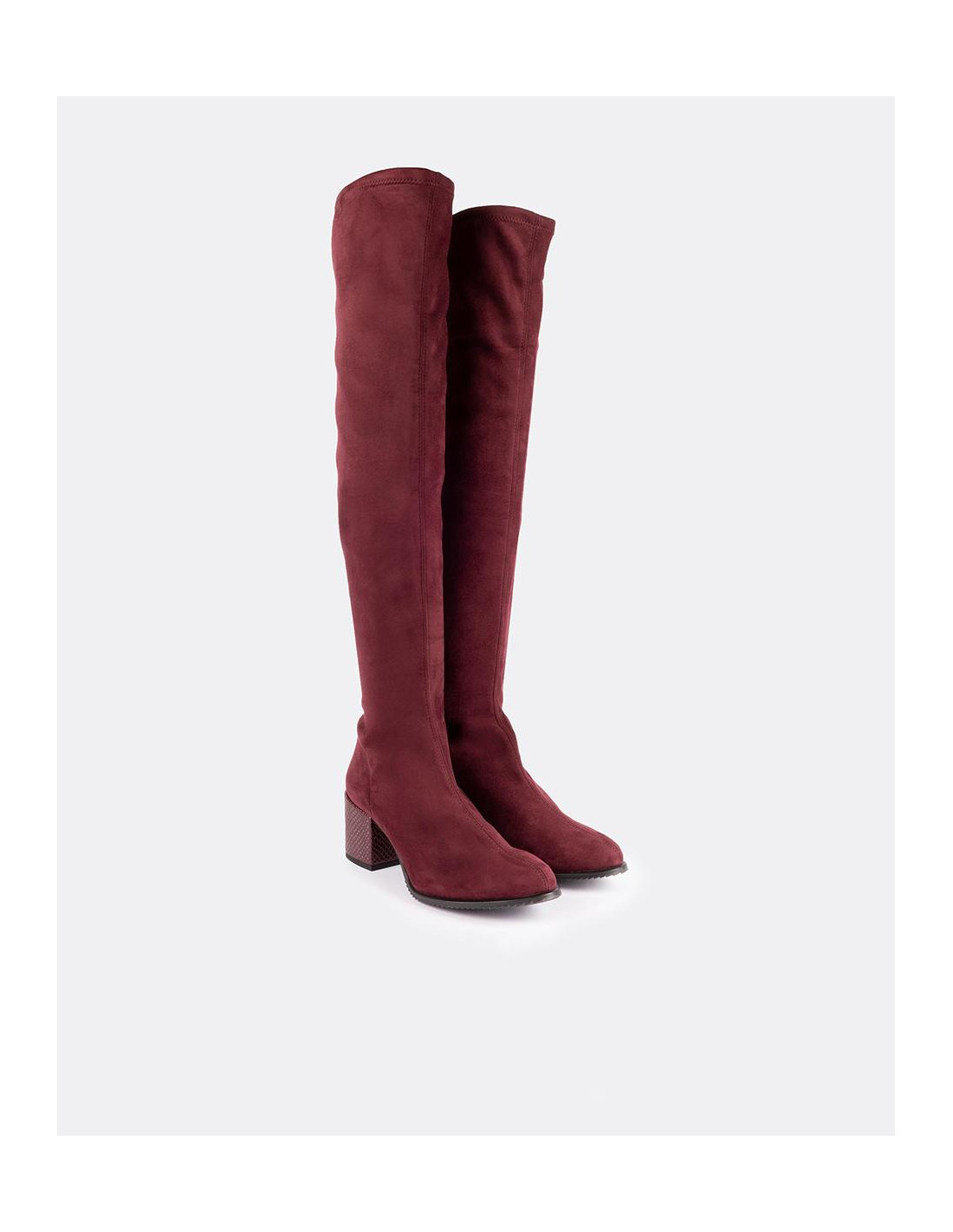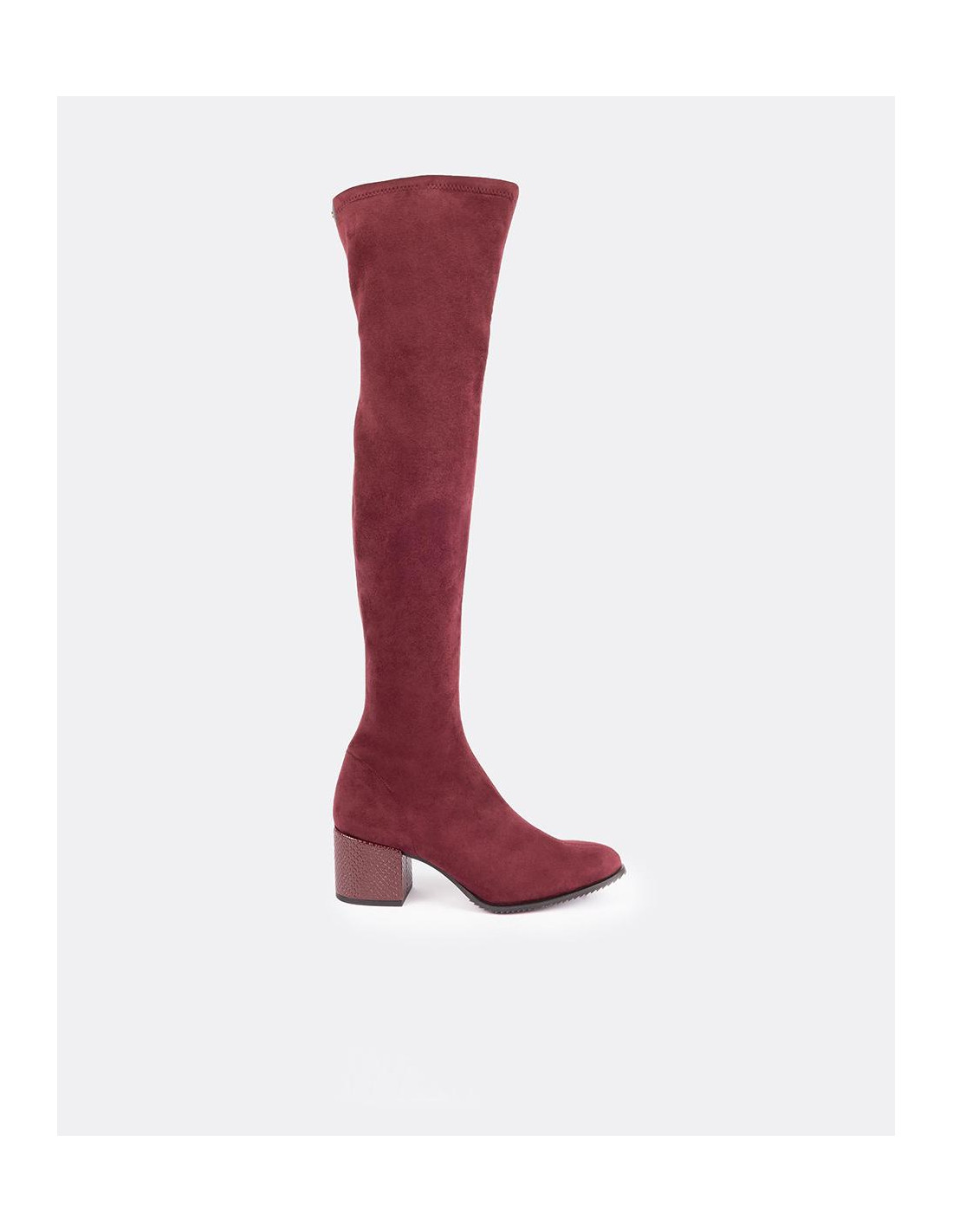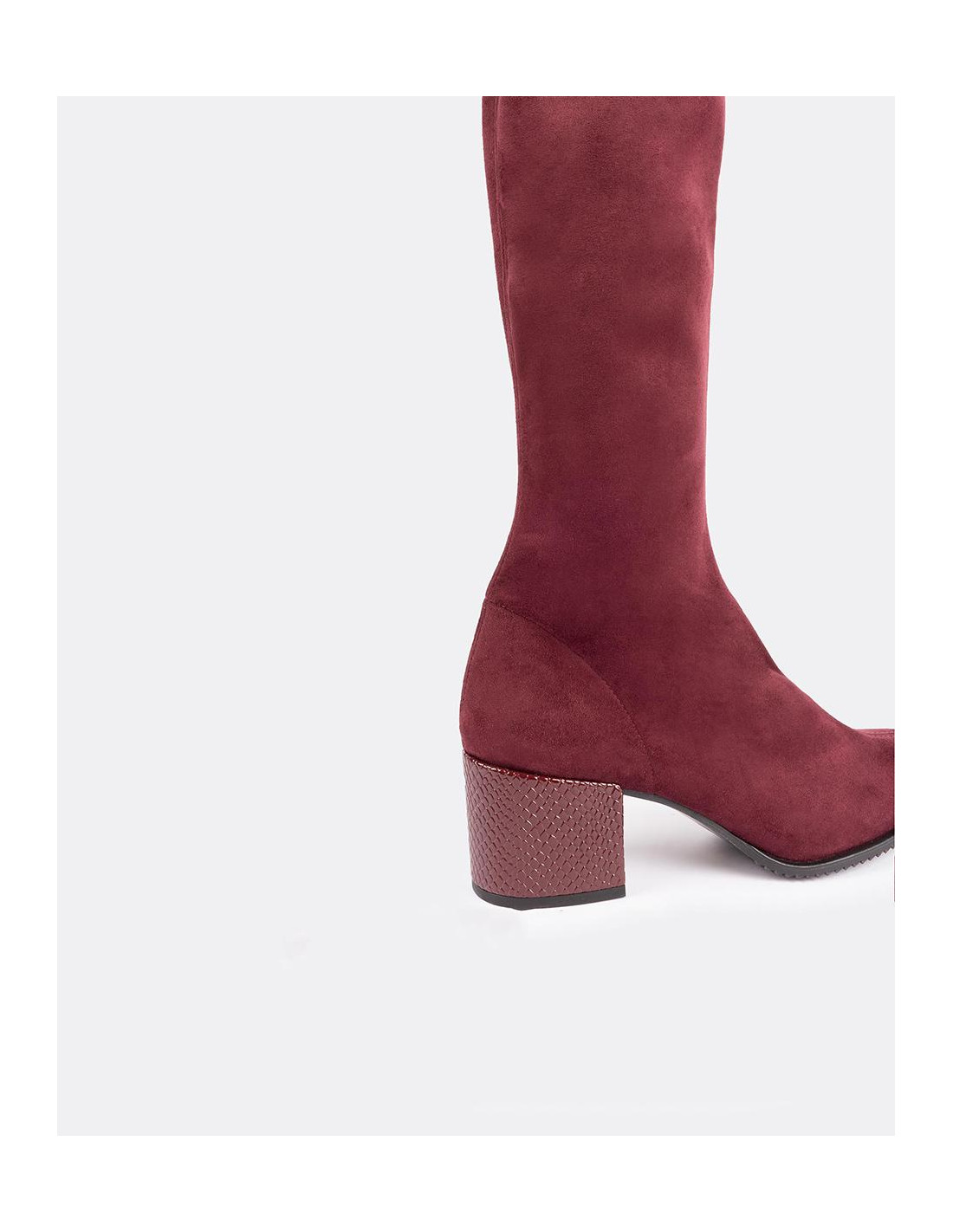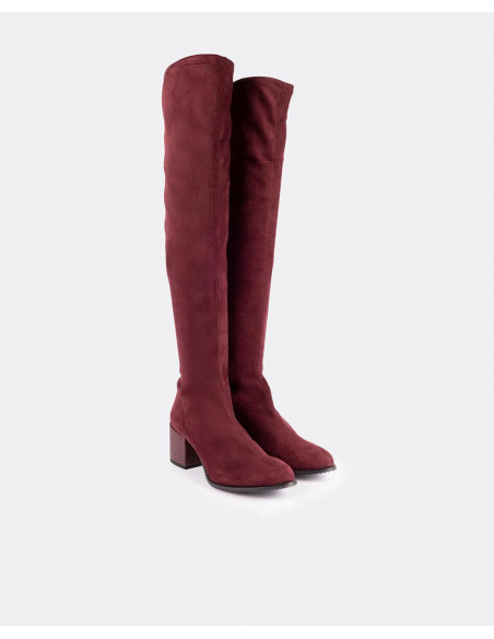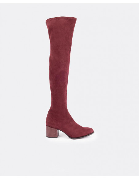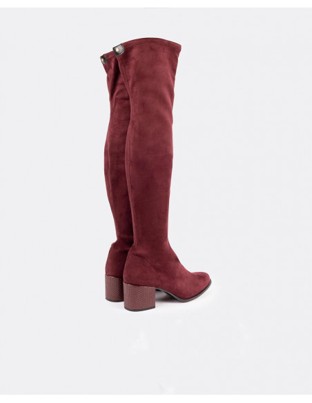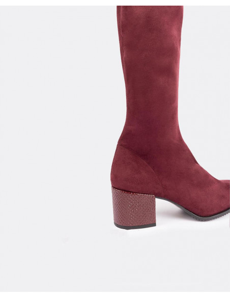 Bota de caña alta fabricada en serraje color burdeos con punta poco pronunciada y tacón medio forrado.