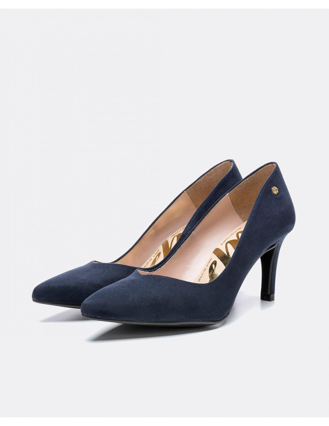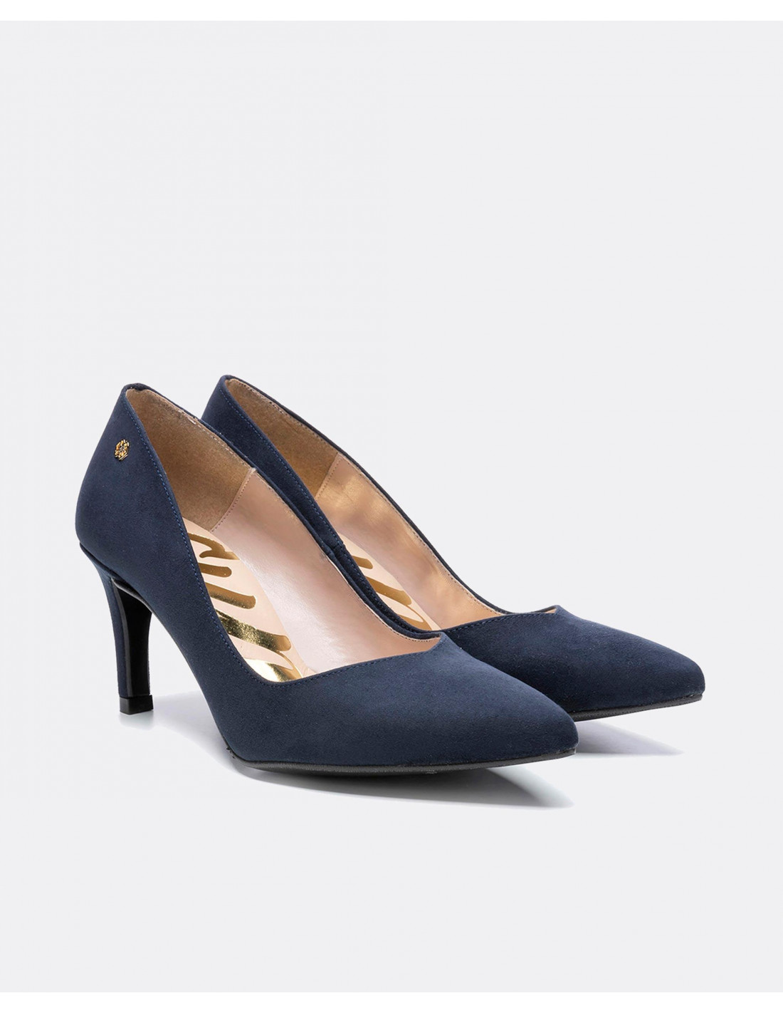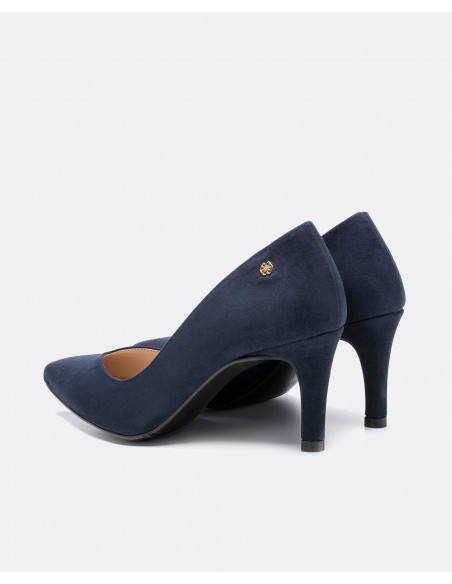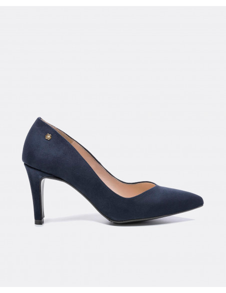 La firma Cuplé te trae una amplia gama de zapatos de salón para que calces en diversas ocasiones. Salón de punta fina en ultrasuede de color azul marino.  Escote en forma de pico. Detalle de fornitura con logo Cuplé en color oro en la parte exterior. Para