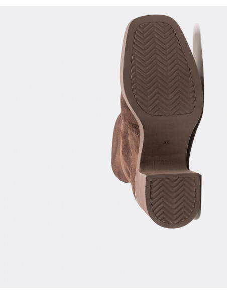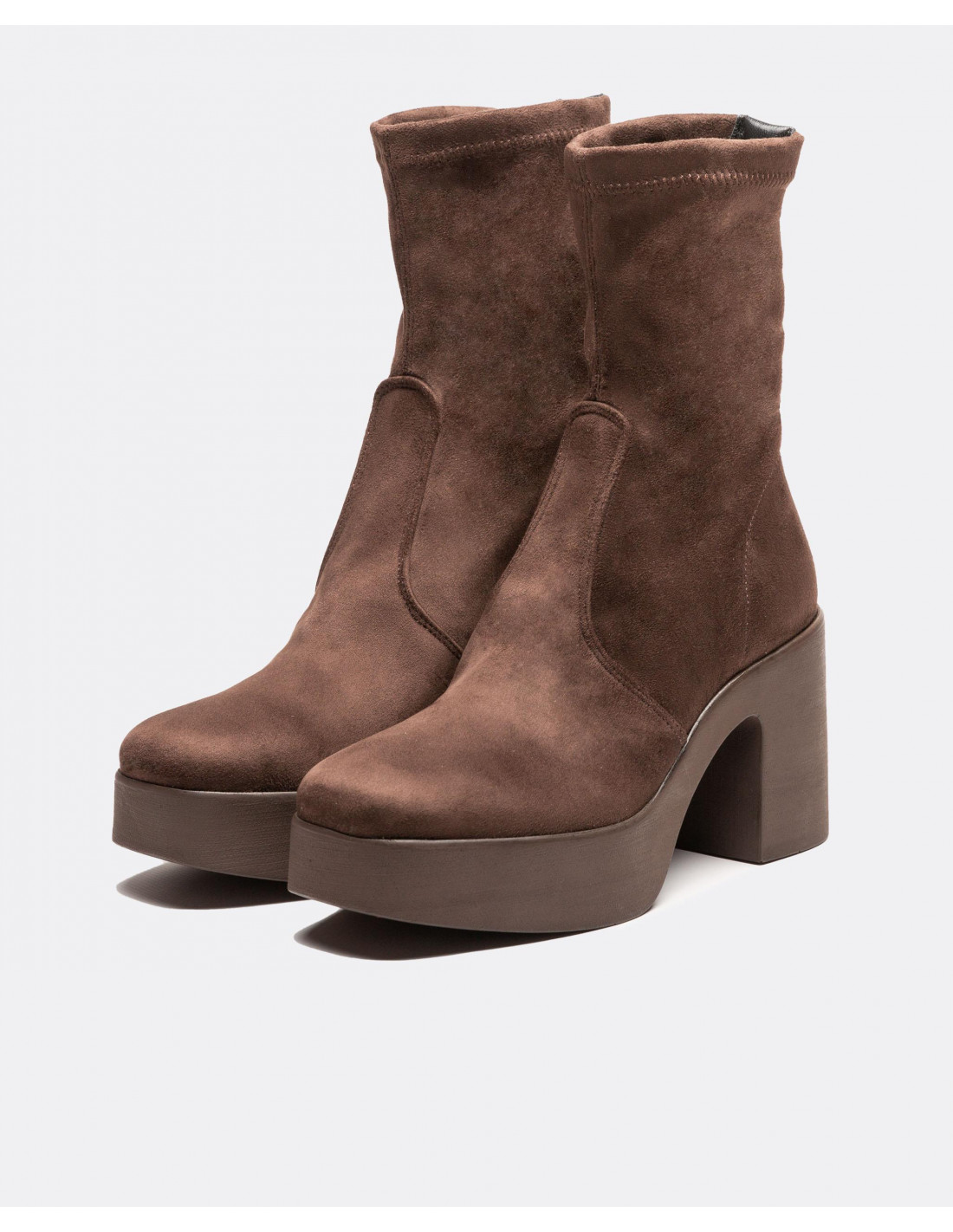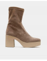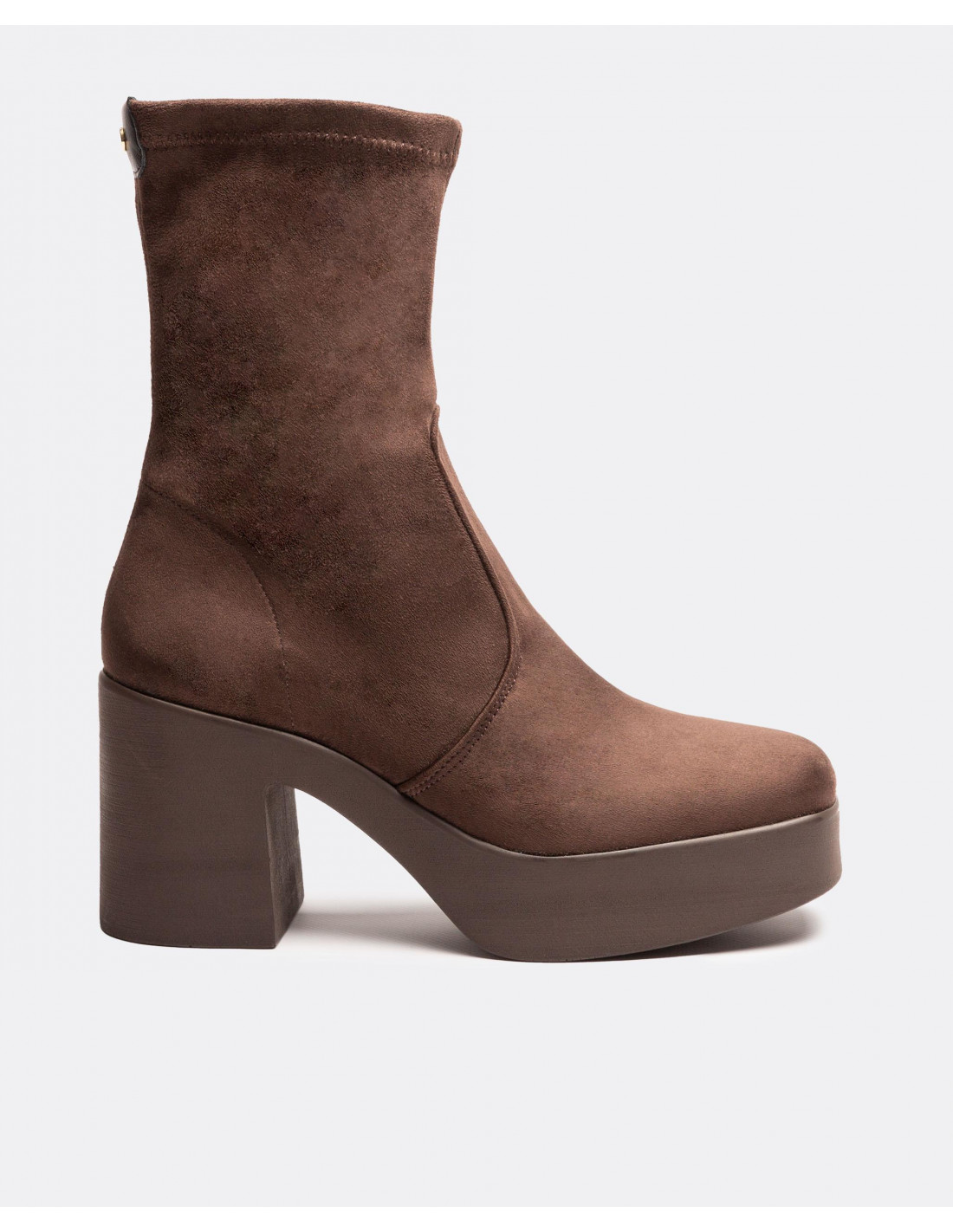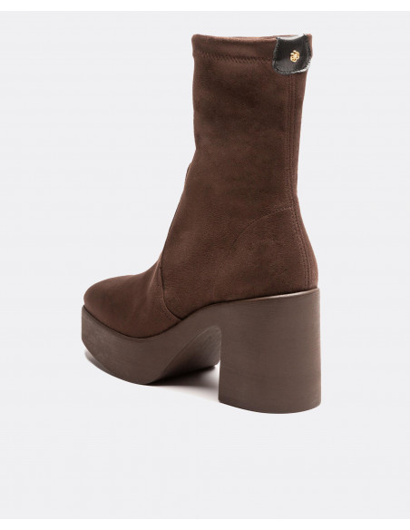 Botín ultrasuede strech estilo calcetín en color marrón. Puntera en forma redondeada. Suela con plataforma y tacón cuadrado.