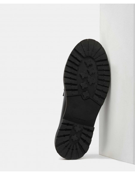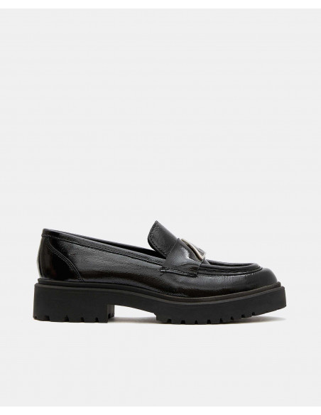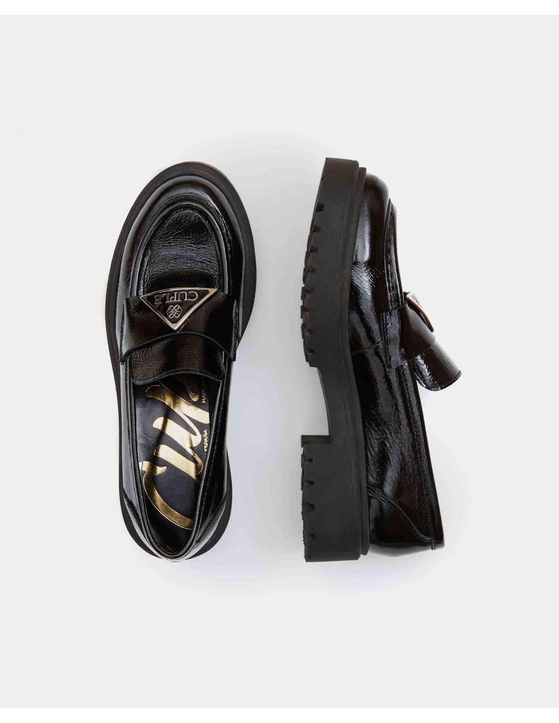 Mocasín acharolado en color negro elaborado en piel de vacuno de máxima calidad. Detalle de chapa triangular en color negro y dorado con el logotipo de la marca Cuplé. Suela estilo track engomada en color beige.