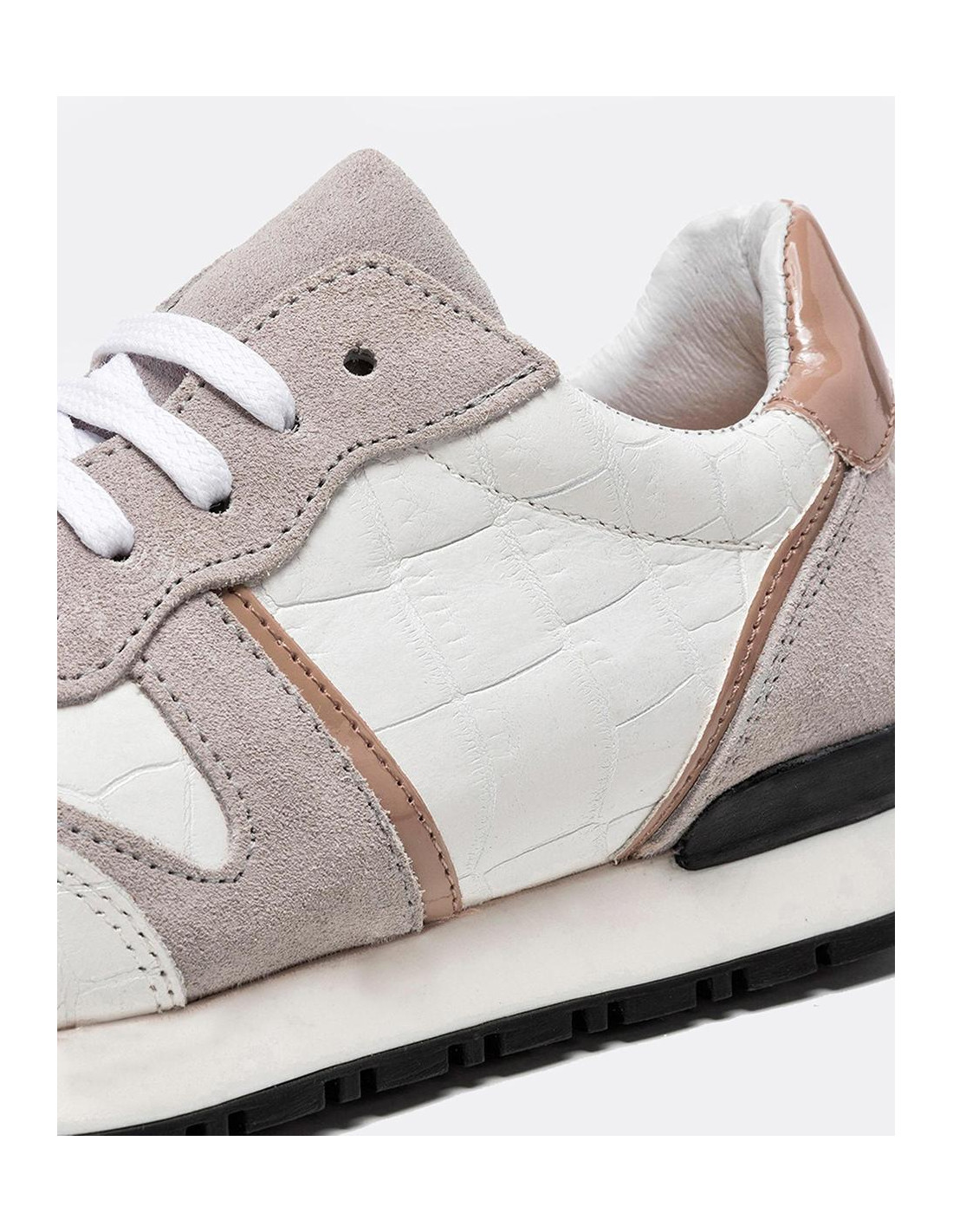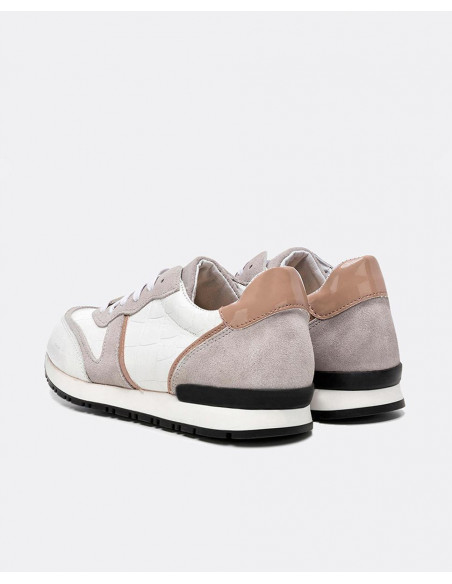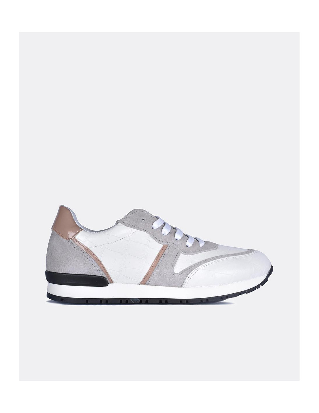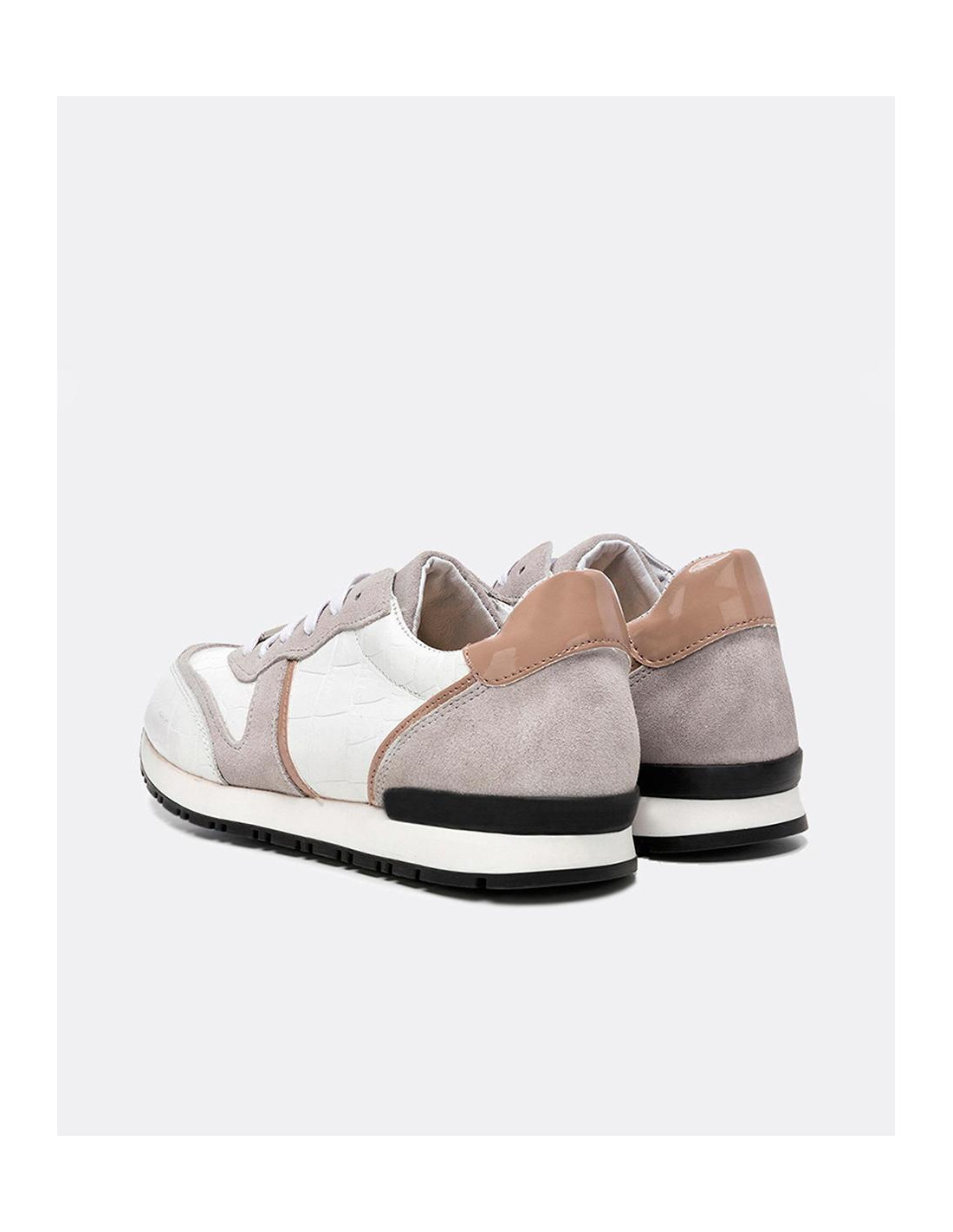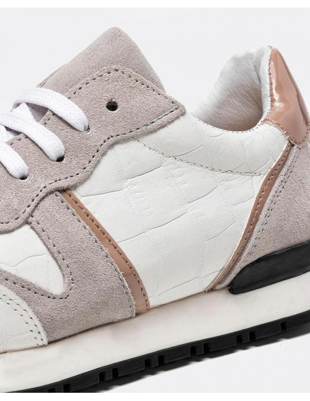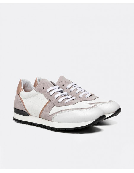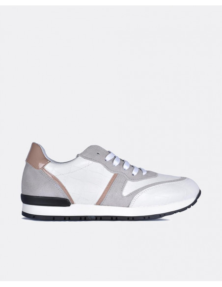 Deportivos Cuplé en tonos blancos. Elaborados en napa con efecto estampado en coco, fabricados con el forro en piel tanto en la parte externa como la parte interior. Presenta la comodidad de una plantilla termoconformada (semi-anatómica) detalles en grise